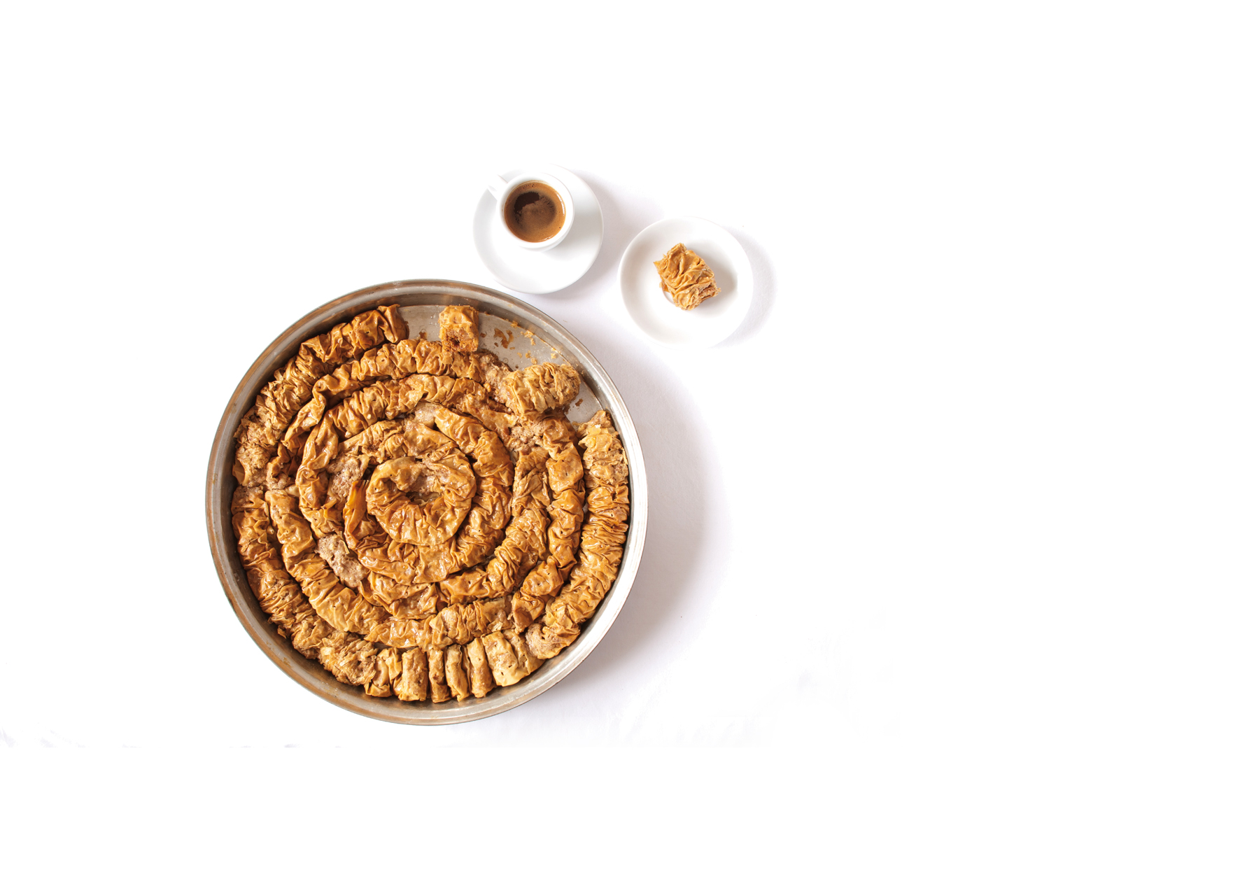 Με τη βοήθεια ενός πινέλου αλείφουµε το 1 φύλλο κρούστας µε το µείγµα του καλαµποκέλαιου µε το ταχίνι. Το πασπαλίζουµε µε τα καρύδια και διπλώνουµε τις άκρες και από τις τέσσερις πλευρές κατά 4 εκ. Τα τυλίγουµε σε ρολά, τα πιέζουµε από τις άκρες στο κέντρο να «σουρώσουν» και τα τοποθετούµε κυκλικά στο ταψί. Τα τρυπάµε µε ένα πιρούνι. Βάζουµε το υπόλοιπο καλαµποκέλαιο να κάψει και τα ζεµατίζουµε. Τα ψήνουµε στον φούρνο σε χαµηλή θερµοκρασία και τα αφήνουµε να κρυώσουν.