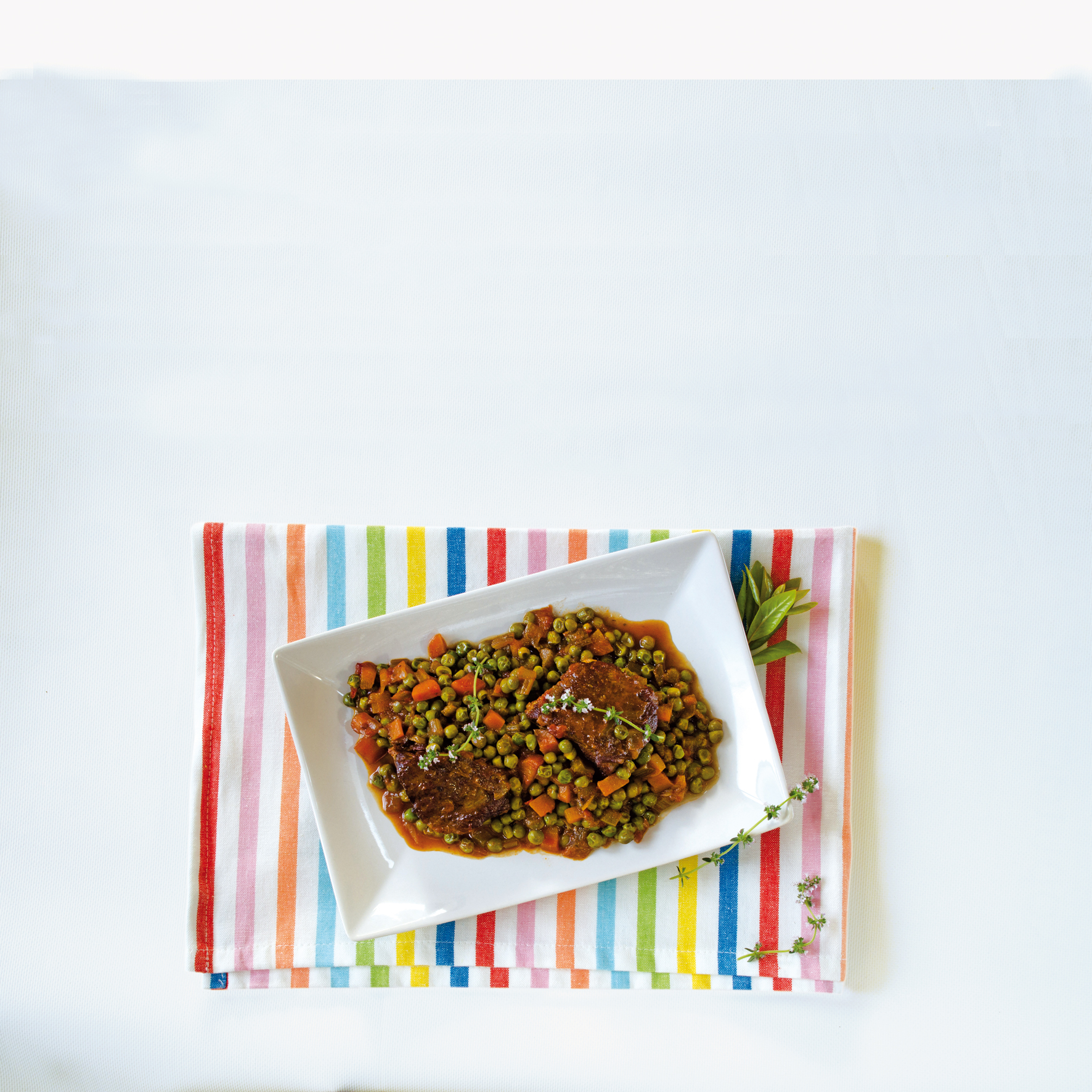Προσθέτουµε τον αρακά και µαγειρεύουµε για 20 λεπτά ακόµη. Σουρώνουµε τον ζωµό και κρατάµε στην άκρη το κρέας και τα λαχανικά.