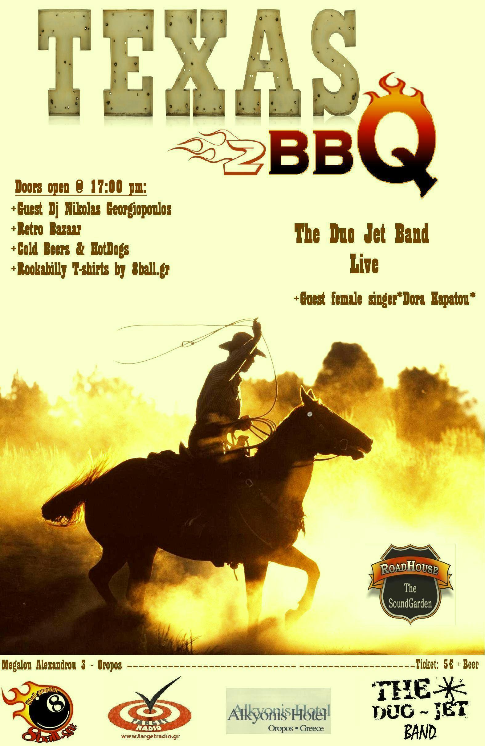 Στην εκδήλωση που ονομάζεται Texas BBQ 2 – Summer 2013 θα λειτουργεί από τις 5 μ.μ. bazaar ρούχων, αξεσουάρ μόδας, μικροεπίπλων και άλλων αντικειμένων που είναι συνδεδεμένα νοσταλγικά με την παλιά καλή εποχή των 50s και του Rock and Roll. Παράλληλα, στον πανέμορφο κήπο του club θα λειτουργεί παραδοσιακό BBQ με χοτ – ντόγκς κα άλλες εκπλήξεις.