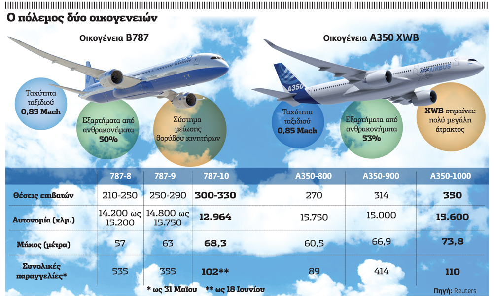 Τα «σουπερτζάμπο» μπορεί να κερδίζουν τις εντυπώσεις, αλλά τα μεσαίου μεγέθους (όχι απαραίτητα και αποστάσεων) αεροσκάφη γεμίζουν τα ταμεία των κατασκευαστριών εταιρειών. Το αξίωμα αυτό κυριάρχησε στην αεροπορική έκθεση που πραγματοποιήθηκε την εβδομάδα που πέρασε στο αεροδρόμιο Μπουρζέ του Παρισιού. Διότι εν μέσω κρίσης και συρρίκνωσης της επιβατικής κίνησης, τουλάχιστον στις ευρωπαϊκές αγορές, το «παιχνίδι» του ανταγωνισμού μεταξύ των δύο κορυφαίων αεροδιαστημικών εταιρειών του πλανήτη, της αμερικανικής Boeing και της ευρωπαϊκής Airbus, φαίνεται πως ξεφεύγει πλέον από τα ιπτάμενα θηρία που μεταφέρουν χίλιους και πλέον επιβάτες και επιστρέφει στα συμμαζεμένα από απόψεως διαστάσεων –αλλά περισσότερο αποδοτικά από οικονομικής απόψεως –αεροσκάφη που μεταφέρουν από 200 ως 400 επιβάτες.