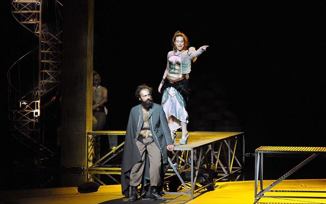 Σε σκηνογραφικό επίπεδο ερχόμαστε και εδώ αντιμέτωποι με άστοχες επιλογές: ένα τετριμμένο βιομηχανικό τοπίο, με λάστιχα, τραπέζια, καρέκλες, κολόνες και μια λιμνούλα για να πλατσουρίζουν οι στρατιώτες αγκαλιά με τις γυναίκες τους εν είδει παρωχημένης φαντασίωσης. Την εικόνα συμπληρώνουν τα στρατιωτικά παλτό-σφαχτάρια που παρελαύνουν κρεμασμένα από γάντζους στις δραματικές στιγμές, κάτι σαν μελό εικαστικό σχόλιο γα τα άψυχα πανωφόρια των αφανών νεκρών. Οσο για τα κοστούμια που φορούν οι γυναίκες θεές, αυτά συνδυάζουν αγαλμάτινα στήθη με φούστες, ζώνες και διάφορα άλλα αξεσουάρ σε ένα φλύαρο πάτσγουορκ που προκαλεί παραζάλη.