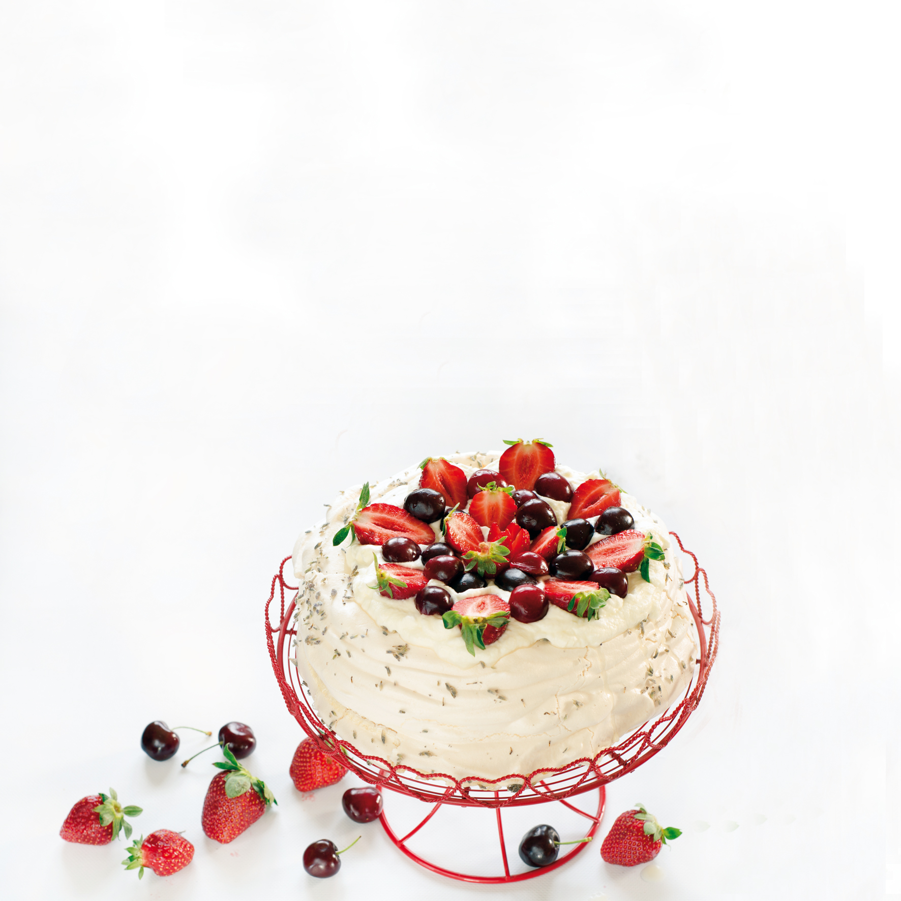 Με µια κουτάλα απλώνουµε τη µαρέγκα σε ένα τσέρκι διαµέτρου 20 εκ., πασπαλίζουµε µε τη λεβάντα και ψήνουµε για περίπου 2-3 ώρες. Αποσύρουµε και αφήνουµε να κρυώσει.