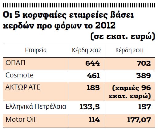 Από το σύνολο των επιχειρήσεων του δείγματος, οι 2.157 (ποσοστό 48,3%) ήταν κερδοφόρες το 2012, με συνολικά κέρδη προ φόρου 3,83 δισ. ευρώ. Το τελικό αποτέλεσμα ωστόσο καθορίστηκε από τις συνολικές ζημιές (4,77 δισ. ευρώ) των ζημιογόνων εταιρειών.