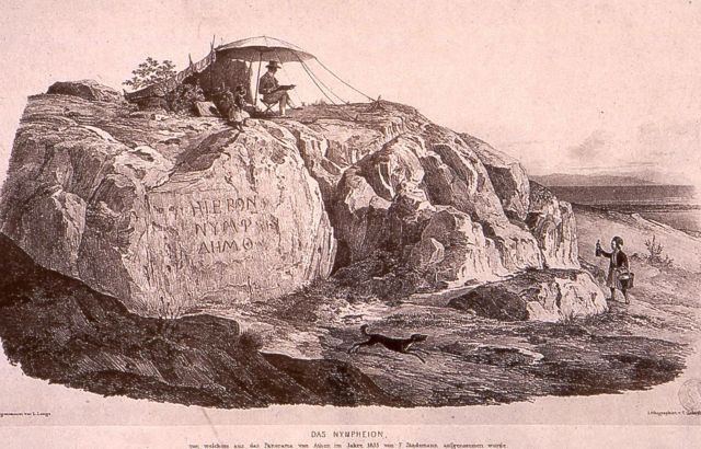 Καθισμένος σε έναν βράχο του λόφου των Νυμφών, κατά τη διάρκεια του «πλέον αφόρητου καύσωνος» της Αθήνας, πλην αρκούντως προστατευμένος από μια ομπρέλα και ένα πρόχειρο αντίσκηνο για τα χρειώδη, ο γερμανός διοικητικός σύμβουλος της Αντιβασιλείας August Ferdinand Stademann σχεδιάζει το άνυδρο καλοκαιρινό τοπίο που ξεδιπλώνεται μπροστά του. Ο βράχος φέρει μια επιγραφή του 5ου αι. π.Χ. που δεν αφήνει περιθώρια αμφιβολιών: ΗΙΕΡΟΝ ΝΥΜΦΟΝ ΔΕΜΟ.