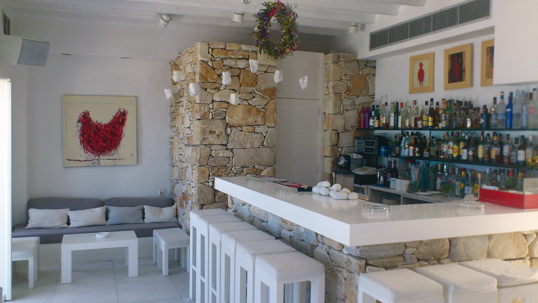 Στο πίσω µέρος του λιµανιού της Νάουσας, σε έναν όµορφο κολπίσκο, βρίσκεται το Fotis art cafe, αγαπηµένο πολλών Παριανών και µη. Στον υψηλής αισθητικής χώρο επικρατεί το λευκό και τον τόνο δίνουν τα διάφορα έργα τέχνης που εκτίθενται στους κάτασπρους τοίχους (οι εκθέσεις αυτές αλλάζουν ανά τακτά χρονικά διαστήµατα). Το µπαρ διαθέτει και τραπεζάκια έξω – όπου έξω εννοούµε την ακρογιαλιά µπροστά στη θάλασσα. Εκεί αποφασίσαµε να καθήσουµε και εµείς για να απολαύσουµε τα ποτά µας υπό τους ήχους ambient µουσικής αγναντεύοντας το πέλαγος. Επιλέξαµε δύο Daiquiri µε φρέσκια φράουλα (κοκτέιλ µε «τσιµπηµένη» τιµή, όπως γενικώς είναι σχεδόν τα πάντα στο νησί. Στο συγκεκριµένο µπαρ, κοκτέιλ στα €10, ποτά στα €7, µπίρα και κρασί στα €5), τα οποία ήταν αξιοπρεπή. Και µόνο, όµως, η θέση αυτού του µαγαζιού, το εξυπηρετικό προσωπικό και η αύρα της θάλασσας αρκούσαν.