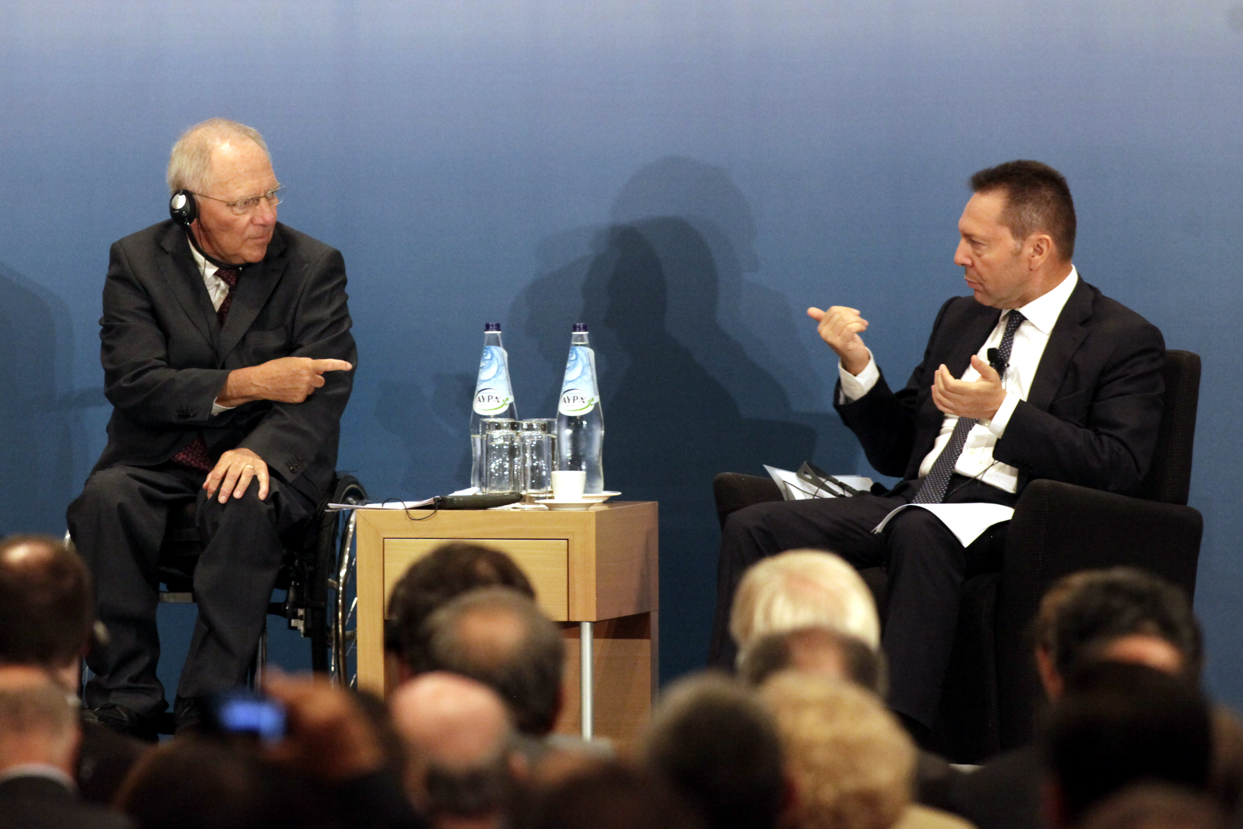 Νωρίτερα την Πέμπτη ο κ. Σόιμπλε είχε ζητήσει να σταματήσει η όποια συζήτηση την τρέχουσα περίοδο για νέο «κούρεμα» του ελληνικού χρέους. Παράλληλα, ο ίδιος διευκρίνισε ότι κατά τη συνάντησή του με τον πρωθυπουργό, Αντώνη Σαμαρά, δεν συζήτησαν για «νέα μέτρα το φθινόπωρο» και για το χρηματοδοτικό κενό. «Δεν μιλήσαμε για το θέμα αυτό και εγώ δεν είμαι ο καθηγητής που θα κάνει μάθημα από άμβωνος στην Ελλάδα. Το πρόγραμμα προχωρά όπως αναμενόταν», δήλωσε, προσθέτοντας, πάντως, ότι «οι αποφάσεις για το 4ο τρίμηνο θα ληφθούν όταν η τρόικα επανέλθει και ολοκληρώσει την αποστολή της». Επιπλέον, επανέλαβε ότι «η Ελλάδα σημείωσε σημαντική πρόοδο αλλά πρέπει να καταβληθούν ακόμα περισσότερες προσπάθειες». Και επανέφερε το θέμα των αλλαγών στο Δημόσιο, λέγοντας χαρακτηριστικά ότι «υπολείπονται πολλά, όπως, για παράδειγμα, στη δημόσια διοίκηση».