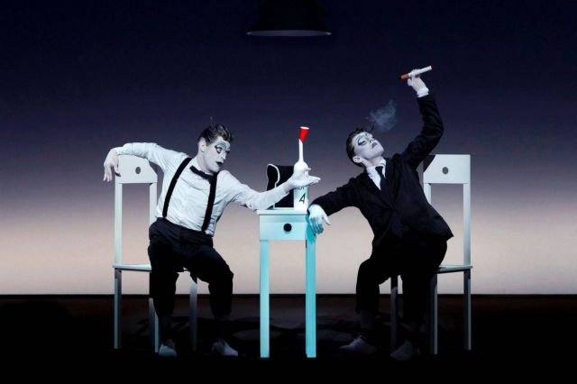 Η αλήθεια είναι ότι και οι δύο πρωταγωνιστές έκαναν τελικά πολλά παραπάνω από το να σηκώσουν το χέρι τους. Χόρεψαν, έτρεξαν, και γενικά την περισσότερη από την περίπου μιάμιση ώρα που διήρκεσε το θέαμα χρειάστηκε να καταβάλουν έντονη σωματική προσπάθεια. Και όλα αυτά ενώ δεν δίστασαν να «τσαλακώσουν» την εικόνα τους αφού το έντονο μακιγιάζ στους τόνους του λευκού και του μαύρου –η ολοκλήρωσή του χρειάζεται γύρω στη μία ώρα –τους μεταμόρφωσε σε κάτι μεταξύ κλόουν και καρτούν: ήρωες ταιριαστοί του «σουρεαλιστικού», παραληρηματικού κάποιες φορές, σύμπαντος του Ρώσου Δανιήλ Χαρμς στο ομότιτλο μυθιστόρημα του οποίου στηρίχθηκε η «Γριά».