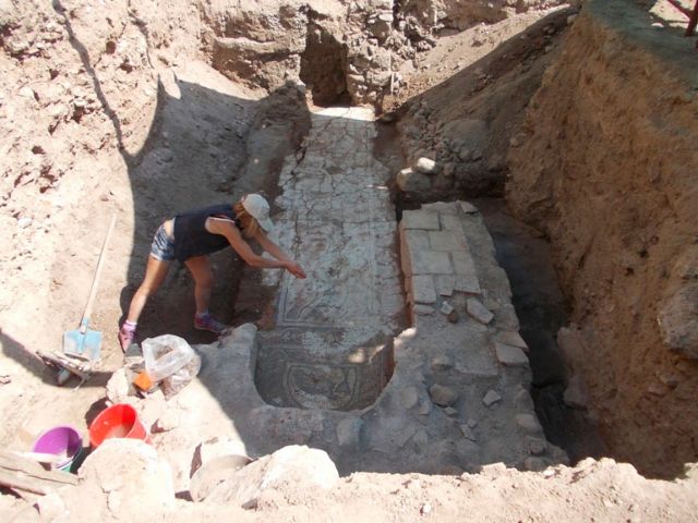 Πολύ πριν από τα μυκηναϊκά ευρήματα ωστόσο και σε βάθος μόλις 1,5 μέτρου ήρθε στο φως ένα ψηφιδωτό της παλαιοχριστιανικής εποχής. Κεφαλόποδα, ψάρια, κοχύλια απεικονίζονται στο ψηφιδωτό που έχει κόγχες στις δύο στενές άκρες του.