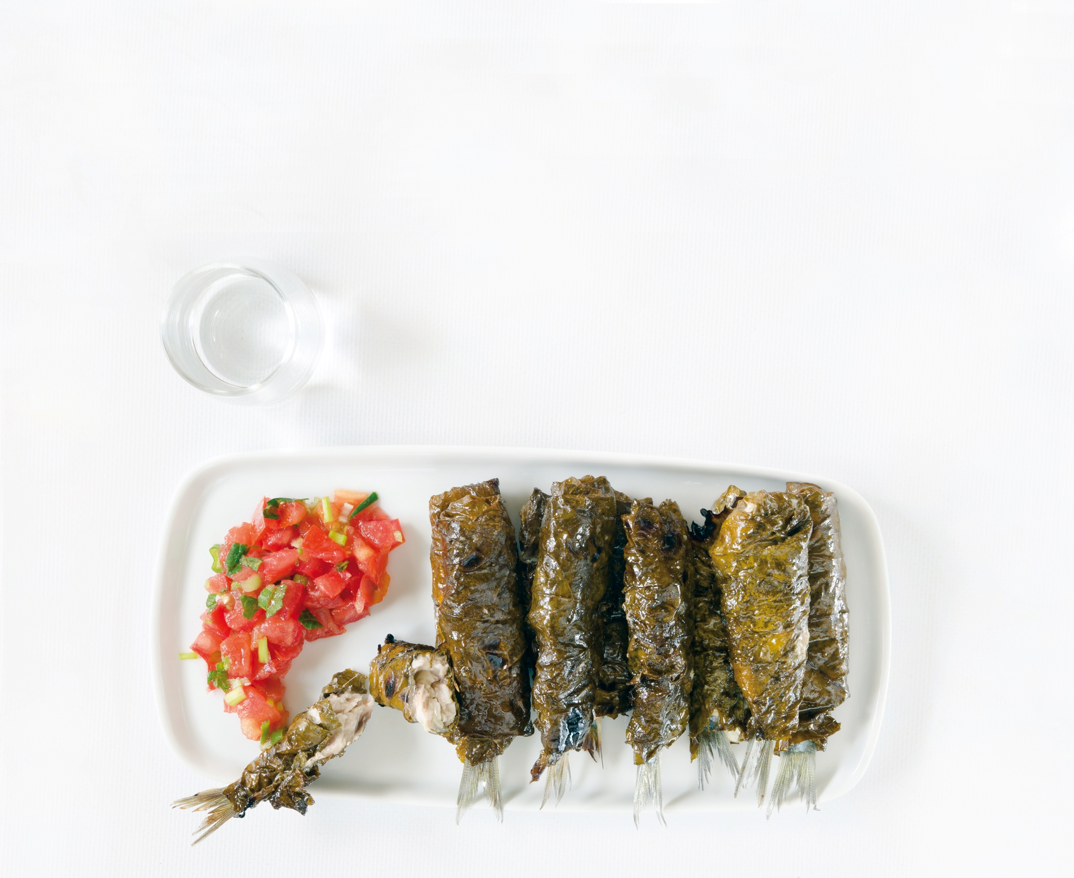 Τυλίγω τις σαρδέλες σε 20 µεγάλα αµπελόφυλλα τα οποία έχω προηγουµένως ζεµατίσει και τα ψήνω στα κάρβουνα. Καθώς τα βγάζω από τη φωτιά, τα βρέχω µε 40 ml λαδολέµονο και τα σερβίρω µε µια σαλατούλα µε ψιλοκοµµένα λαχανικά, 2-3 ντοµάτες, 1 φρέσκο κρεµµυδάκι και 5-6 φύλλα δυόσµου (υλικά για 2-4 άτοµα).