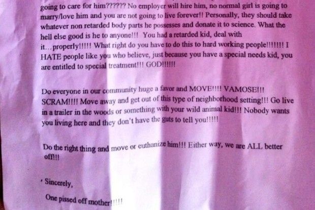 «Έχετε ένα καθυστερημένο παιδί, φερθείτε του ανάλογα!», γράφει στη συνέχεια η γειτόνισσα. «Δεν έχετε το δικαίωμα να το κάνετε αυτό σε σκληρά εργαζόμενους ανθρώπους. Κάντε σε όλους μας μια χάρη και μετακομίστε, γίνετε καπνός! Θα ‘ταν καλύτερα αν ζούσατε σ’ ένα τροχόσπιτο στο δάσος με το άγριο ζώο που έχετε για παιδί».