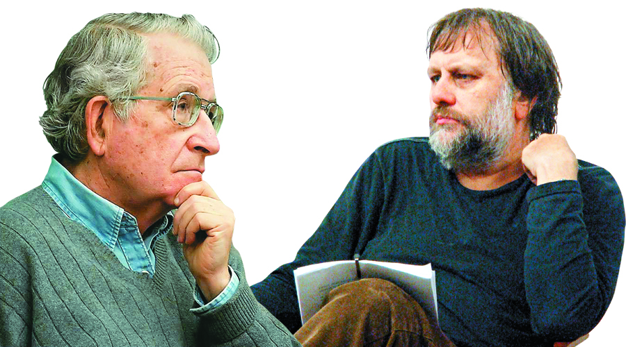 Ο Αμερικανός Νόαμ Τσόμσκι από τη μία –ο ηπίως αναρχικός γλωσσολόγος αλλά και μαχητικός ακτιβιστής κατά του ιμπεριαλισμού –και ο Σλοβένος Σλαβόι Ζίζεκ από την άλλη –ο πληθωρικός κομμουνιστής ψυχαναλυτής που έχει χαρακτηριστεί από φιλοσοφικός «γίγαντας της Λιουμπλιάνας» ως «Ελβις Πρίσλεϊ της πολιτισμικής θεωρίας» –είναι αναμφιβόλως τα πλέον αναγνωρίσιμα «εικονίσματα» της σύγχρονης ριζοσπαστικής Αριστεράς. Οι παρεμβάσεις τους είναι τακτικότατες και συζητούνται ευρέως. Οι απόψεις τους «δίνουν γραμμή», καταπώς λέμε, σε πολιτικά κόμματα, φορείς και ετερόκλητες συλλογικότητες ανά τον κόσμο –η Ελλάδα βεβαίως δεν αποτελεί εξαίρεση, καθώς ο ΣΥΡΙΖΑ, η σημερινή αξιωματική αντιπολίτευση, έχει εναγκαλιστεί δημοσίως με τις μεταμαρξιστικές αναλύσεις του.