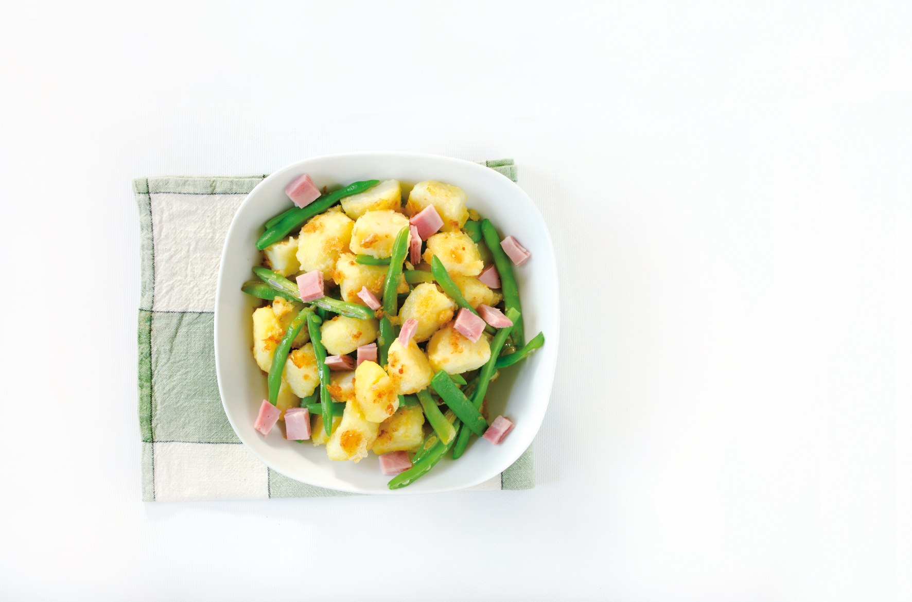 Σε άλλη κατσαρόλα, σε µέτρια φωτιά, βράζουµε ξεχωριστά τα φασολάκια, προσέχοντας να παραµείνουν τραγανά. Τα σουρώνουµε καλά και τα σοτάρουµε στο τηγάνι, µε 1 κ.σ. λάδι, για µερικά λεπτά. Ρίχνουµε το περιεχόµενο του τηγανιού στη σαλατιέρα, προσθέτουµε το ζαµπόν, περιχύνουµε µε τον χυµό λεµονιού και 1 κ.σ. ελαιόλαδο, αλατοπιπερώνουµε και ανακατεύουµε απαλά.