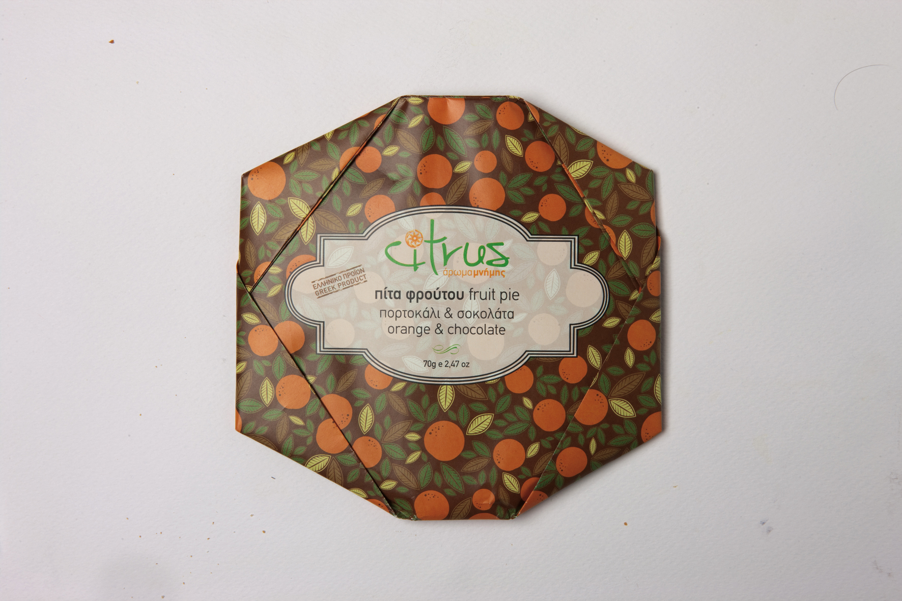 Πίτα φρούτου που θυµίζει χαλβαδόπιτα. Η λεπτή εξωτερική βάφλα περικλείει στο εσωτερικό της πάστα από αποξηραµένο πορτοκάλι, ξηρούς καρπούς και σοκολάτα. Πρακτικό στη µεταφορά, €1,45/70 γρ.