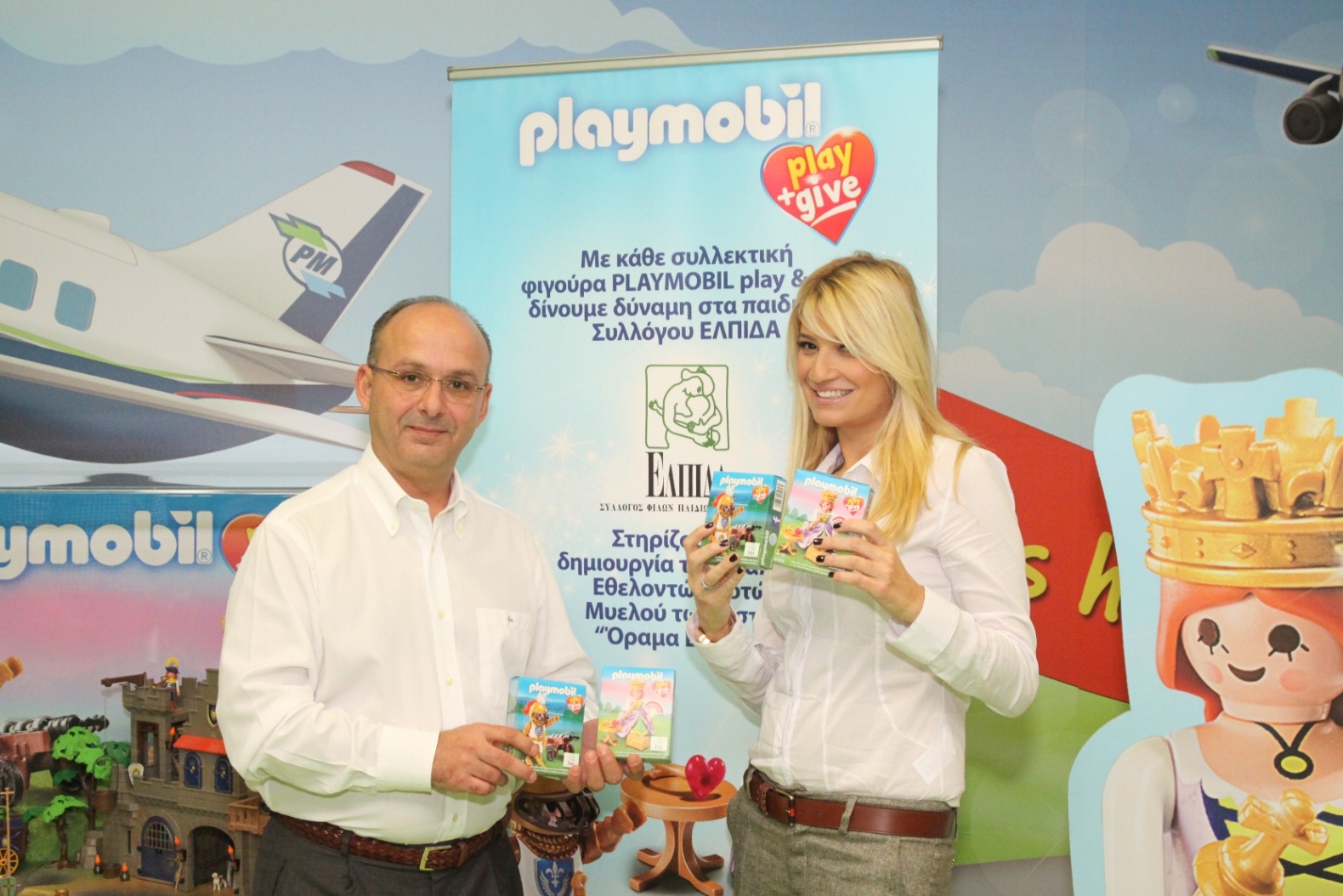 Το PLAYMOBIL play & give είναι μια πρωτοποριακή ενέργεια για την PLAYMOBIL διεθνώς, η οποία αναδεικνύει στην πράξη την αλληλεγγύη της στα άρρωστα παιδιά που χρειάζονται τη στήριξή μας, αυτή τη δύσκολη περίοδο. Μέρος των εσόδων από τις πωλήσεις των συλλεκτικών φιγούρων θα διατεθεί στο Σύλλογο ΕΛΠΙΔΑ για την ενίσχυση του νέου του έργου: τη δημιουργία της Τράπεζα Εθελοντών Δοτών Μυελού των Οστών, η οποία θα εξασφαλίσει σε όλα παιδιά που το χρειάζονται το απαραίτητο μόσχευμα για τη ζωή τους, που σήμερα το αποκτούν με δυσκολία και συχνά με μεγάλο κόστος.
