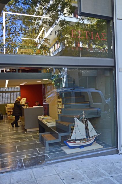 Οι κάτοικοι της γειτονιάς εξερευνούν το κατάστημα και ψωνίζουν. Ο υπεύθυνος του βιβλιοπωλείου Πολύκαρπος Νικολόπουλος κερνάει σοκολατάκια μαργαρίτες για το καλωσόρισμα. Το μηχανογραφικό σύστημα έχει κρασάσει, κόβει χειρόγραφες αποδείξεις και απολογείται με χαμόγελο για την καθυστέρηση. Κανείς δεν φαίνεται να ενοχλείται. Ευκαιρία να περιεργαστούν λίγο ακόμη τον χώρο. Σκούρο γκρι πλακάκι, υπόλευκα ράφια, ένας κρεμεζί τοίχος, στην απόχρωση της πυροστιάς στο λογότυπο της «Εστίας». Την τζαμαρία στο βάθος διατρέχουν λέξεις με μαύρα και κόκκινα στοιχεία, δημοφιλείς τίτλοι της «Εστίας». «Πόσα βιβλία της Εστίας έχω», σκέφτομαι, «και πόσα μου λείπουν». Βλέποντας όλους τους τίτλους της συγκεντρωμένους, παρατηρείς αναπόφευκτα πόσο συνδεδεμένο είναι το όνομα του οίκου με την αναγνωστική μας ιστορία.
