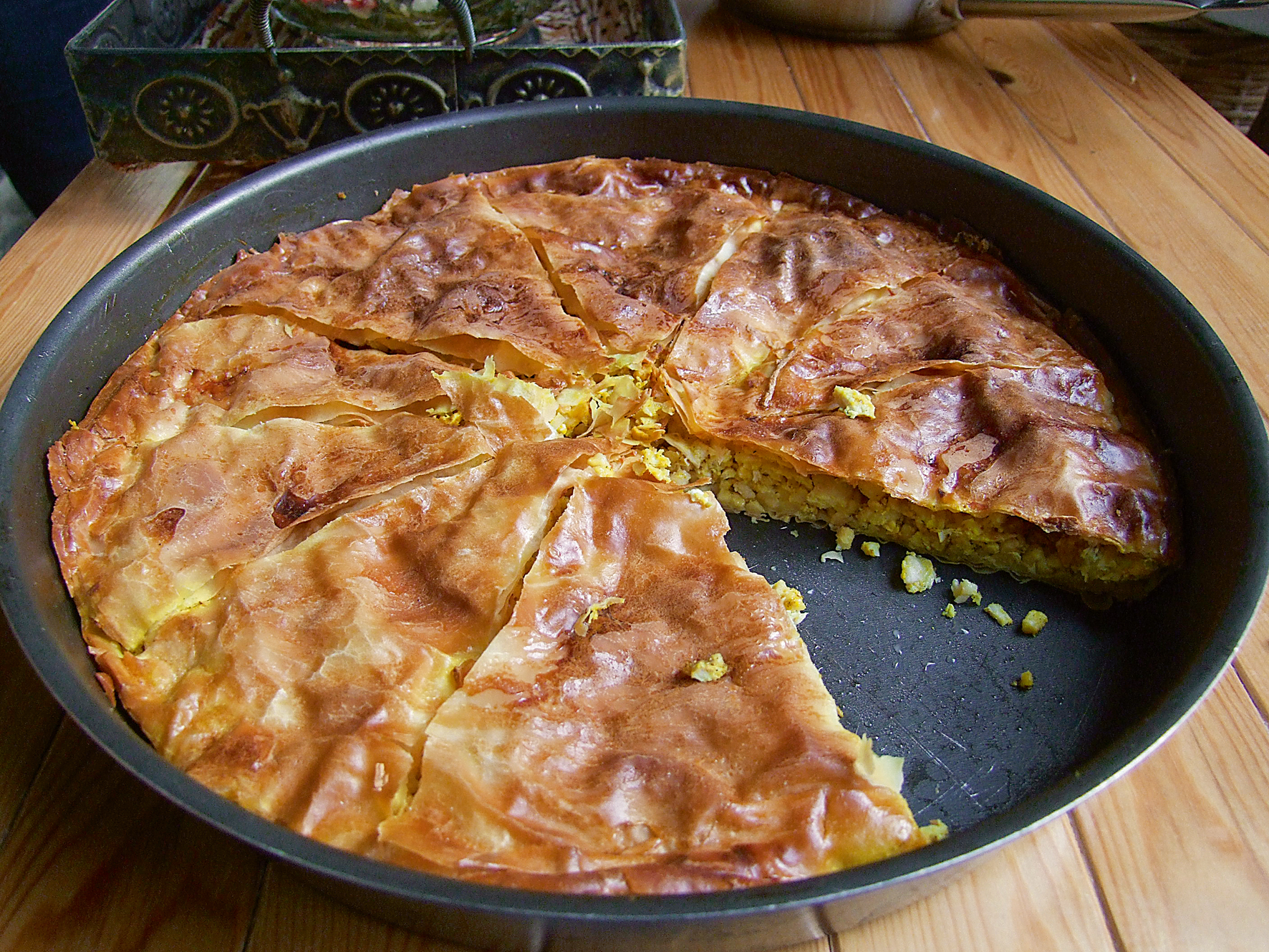 2 Προθερµαίνουµε τον φούρνο στους 180°C. Λαδώνουµε ένα στρογγυλό ταψί φούρνου και στρώνουµε διαδοχικά τέσσερα φύλλα, λαδώνοντάς τα ένα-ένα µε τη βοήθεια ενός πινέλου. Απλώνουµε τη γέµιση και σκεπάζουµε µε τα υπόλοιπα τέσσερα, λαδώνοντάς τα επίσης ένα ένα.