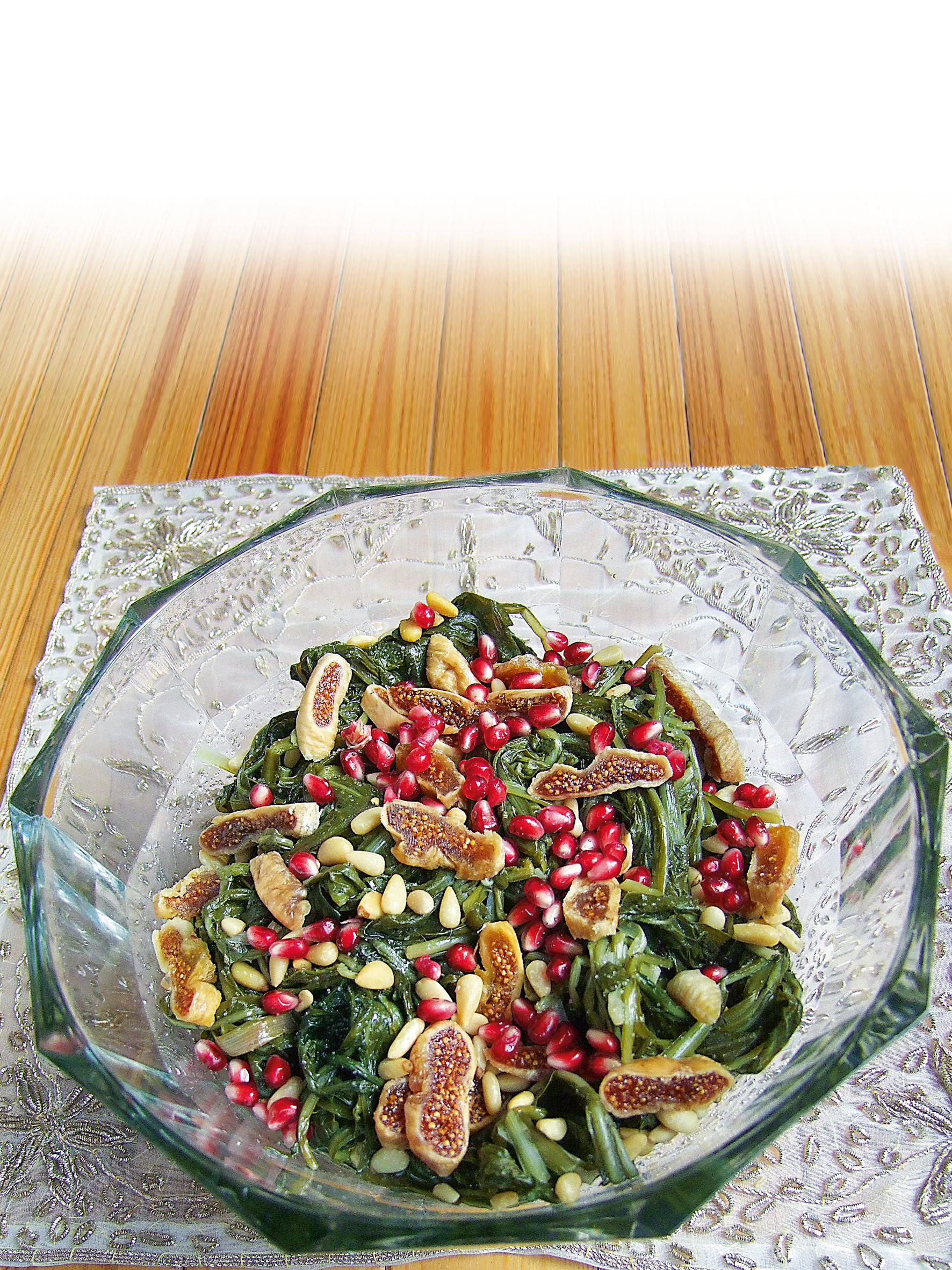 Προσθέτουµε τα σύκα, το κουκουνάρι και τους σπόρους του ροδιού. Σε ένα µπολ χτυπάµε το ελαιόλαδο, το µηλόξιδο και το αλάτι και περιχύνουµε τη σαλάτα.