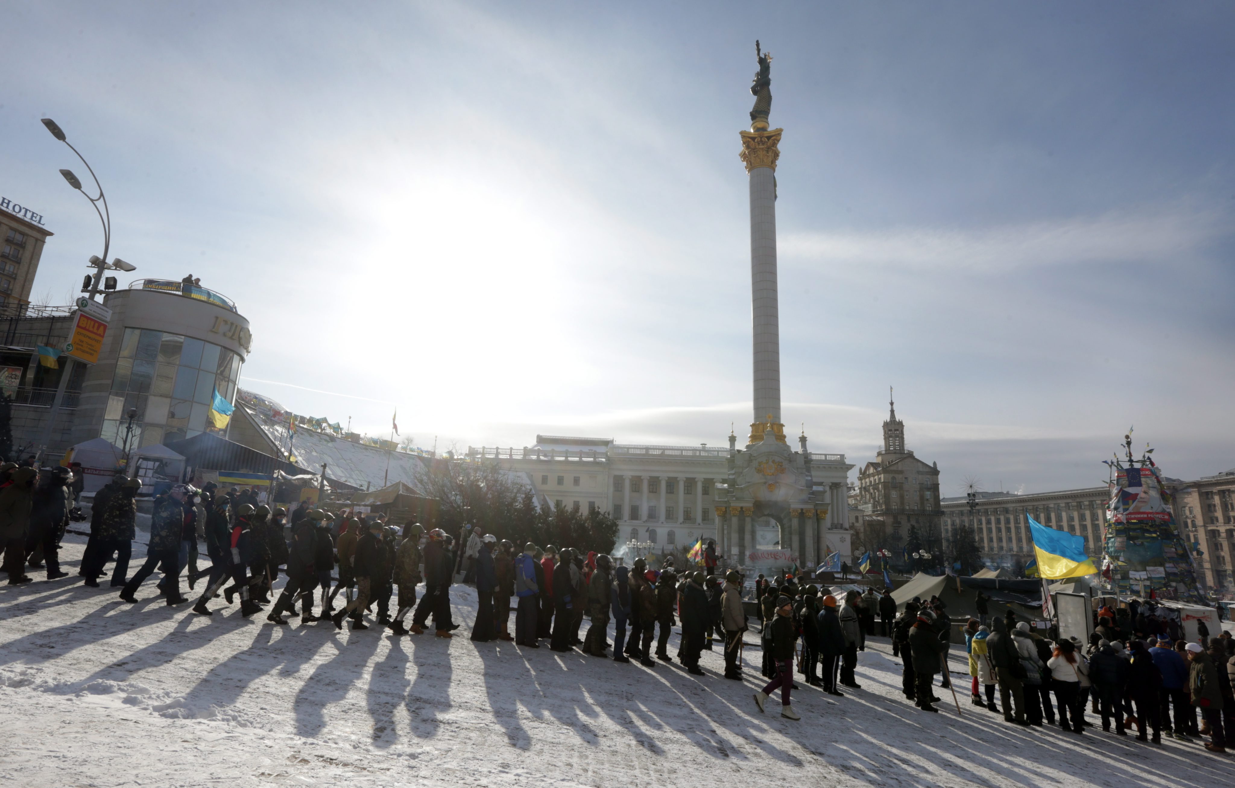 Στο κέντρο του Κιέβου, που έχει καλυφθεί από ένα ελαφρύ στρώμα χιονιού, επικρατούσε ηρεμία την Τετάρτη, μετά από πολλές ημέρες ταραχών.