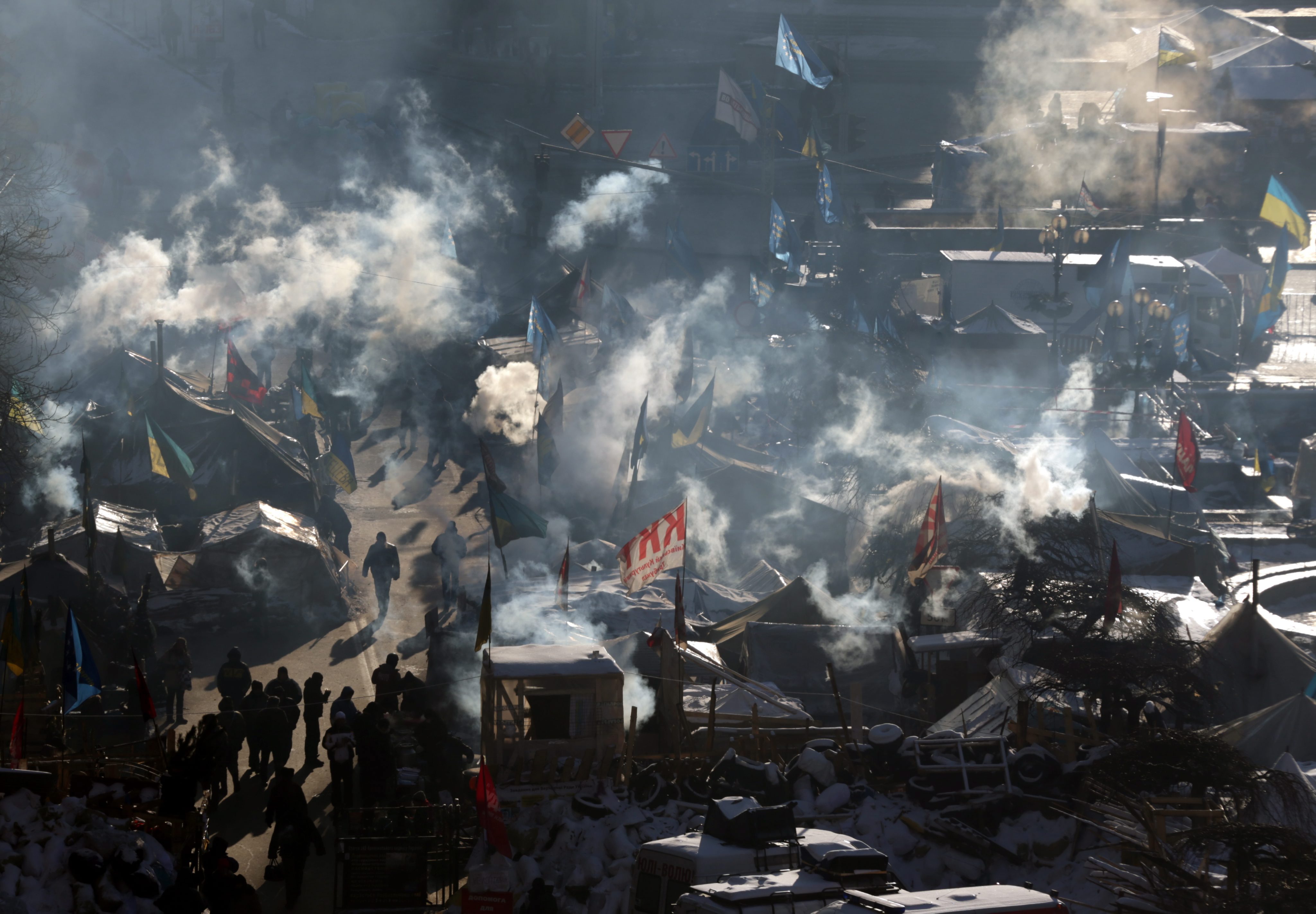 Την Πέμπτη, οι αντικυβερνητικοί διαδηλωτές παρέμεναν στις συγκεντρώσεις απαιτώντας την παραίτηση του Γιανούκοβιτς. Η Πλατεία Ανεξαρτησίας στο Κίεβο είναι γεμάτη από κατασκηνωτές -ακόμη και υπό -19 βαθμούς Κελσίου- ενώ η αστυνομία επιτηρεί διακριτικά.