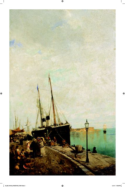«Στην αποβάθρα» το νέας τεχνολογίας για την εποχή του ατμόπλοιο, τριγυρισμένο από παλαιικά σκαριά και πλαισιωμένο από την ακινησία της θάλασσας και του ουρανού, μοιάζει να ετοιμάζεται να αποπλεύσει προς το μέλλον. Ολη η κίνηση συγκεντρώνεται μπροστά του, στην αποβάθρα, και τη δίνουν οι άνθρωποι και η ζωή τους. Η αποβάθρα είναι ο διάδρομος απογείωσής της, το κέντρο της, το πεδίο σύνθεσης ενός ανθρώπινου παζλ, ποικιλόμορφου, από χαμίνια του λιμανιού, καθώς πρέπει κορίτσια και κυρίες με τις δαντέλες τους, τα καπέλα και τις ομπρέλες τους, επιβάτες που περιμένουν την αναχώρηση του πλοίου, υπαίθριους πωλητές που έχουν στο βάθος τους πάγκους τους. Το μικρό λιμάνι δεν έχει όνομα. Ή μάλλον η ταυτότητά του είναι αυτή ακριβώς η εικόνα της ζωής που κυλά. Και βεβαίως έχει αναγνωρίσιμη ταυτότητα ο δημιουργός της. Η ακρίβεια της ζωγραφικής του Κωνσταντίνου Βολανάκη είναι η μεγάλη δύναμή της. Η εξάρτηση του πλοίου, η αμφίεση των ανθρώπων, ο φανοστάτης, το άχρηστο καλάθι, τα χαλασμένα φρούτα, τα απομεινάρια μιας μέρας στο λιμάνι δεν είναι τεχνικά επιτεύγματα αλλά η ίδια η ψυχή του έργου, η ελευθερία του, η ποιητική και ρομαντική ατμόσφαιρά του, όλα αυτά που το κάνουν δυναμικό έργο τέχνης και όχι ένα στιγμιαίο φωτογραφικό ενσταντανέ.