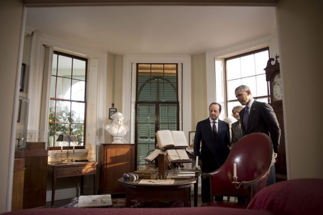 Ο Ομπάμα ξενάγησε τον Ολάντ στο Μοντιτσέλο, τη νεοκλασική οικία του Τόμας Τζέφερσον λίγο έξω από το Σαρλότσβιλ της Βιρτζίνια, μια έπαυλη που φέρει τη σφραγίδα των ετών που ο Τζέφερσον έζησε στο Παρίσι ως διπλωματικός απεσταλμένος των ΗΠΑ.