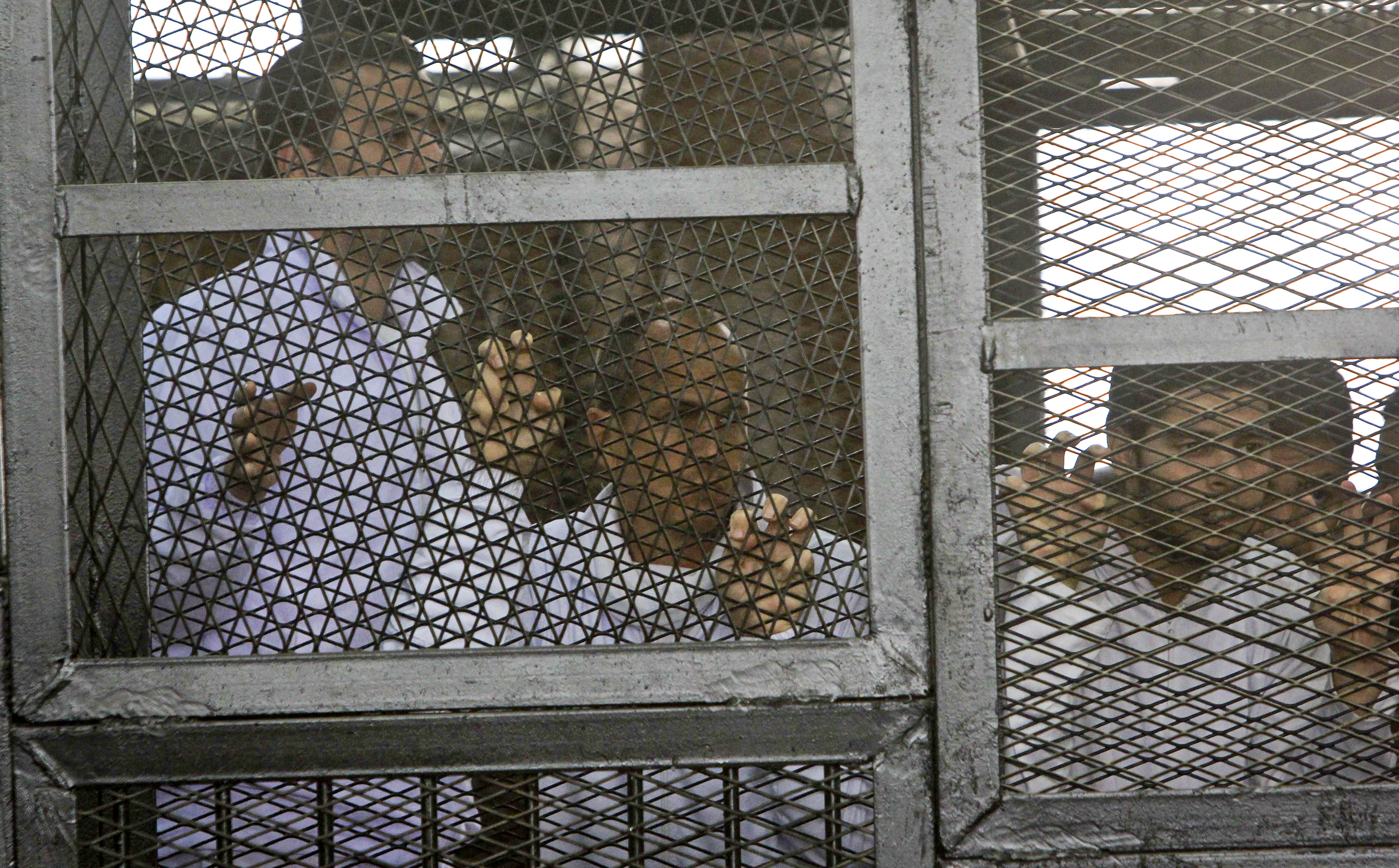 Επαναλαμβάνεται η δίκη των δημοσιογράφων του al-Jazeera, τους οποίους η Αίγυπτος κατηγορεί «για τρομοκρατία». Οι κατηγορούμενοι παρακολούθησαν τη δίκη μέσα από κλουβιά.
