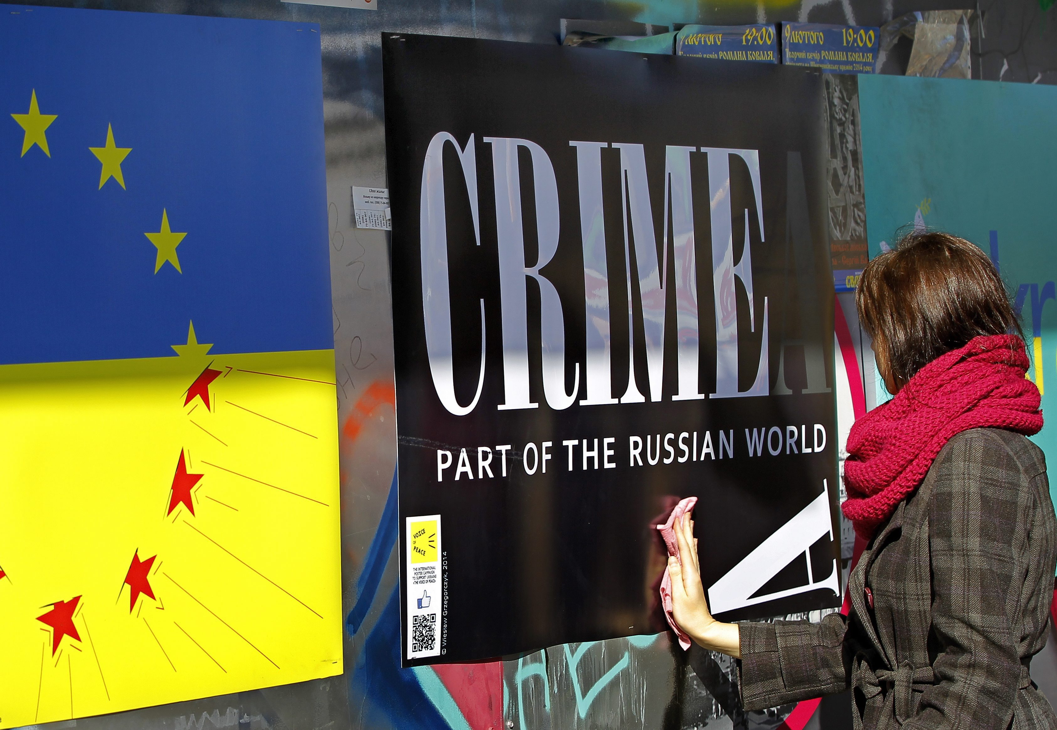 epa04121754 A Ukrainian student wipes a printed artwork which is part of an open air exhibition made by design students with the theme of the Ukraine - Russia conflict over Crimea, near Independence Square in Kiev, Ukraine, 12 March 2014. The USA and European Union have threatened sanctions against Moscow over the military standoff in the strategic Crimean peninsula, and are urging Russia to pull back its forces in the region and allow in international observers and human rights monitors. Crimea, which has a majority ethnic Russian population, is strategically important to Russia as the home port of its Black Sea Fleet. EPA/ROBERT GHEMENT (File: 13767794.jpg )