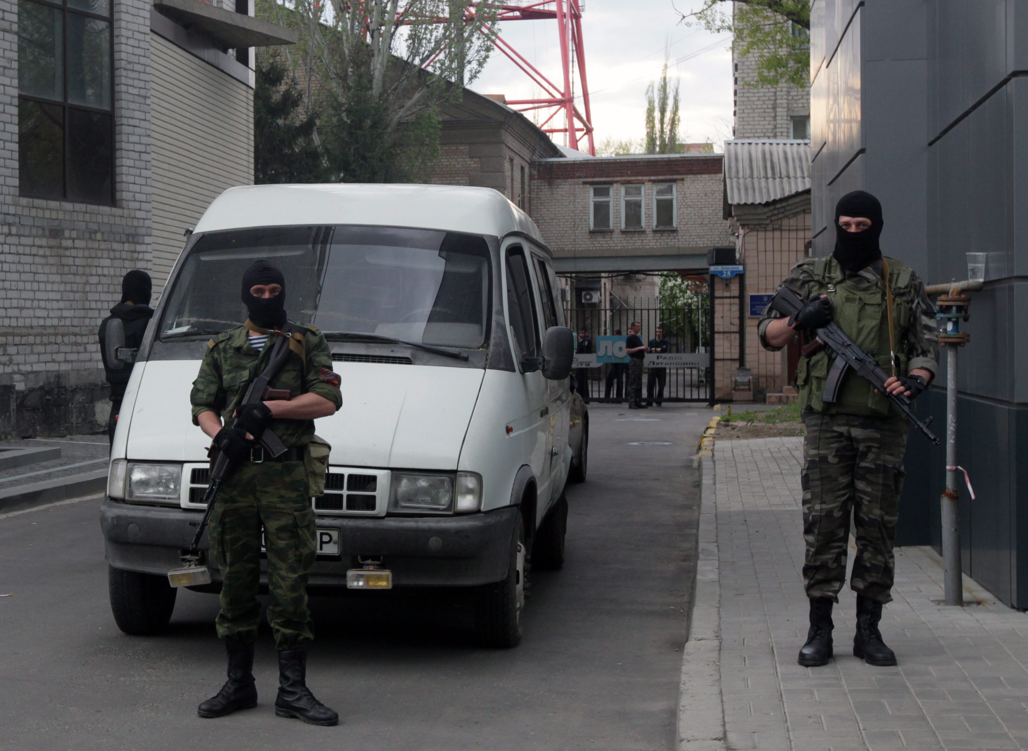 epa04185430 Pro-Russian armed men block the television tower in Lugansk, Ukraine, 29 April 2014. Protesters in eastern Ukraine seized another key administrative building on Tuesday as the European Union and Russia traded barbs about the latest round of Western sanctions. A more-than-2,000-strong pro-Russian crowd stormed the regional administration building in Luhansk, local media reported. The activists, many of them wearing masks and camouflage, were met with no resistance from police and hoisted the Russian flag, the ostro.org news site reported. EPA/ZURAB KURTSIKIDZE (File: 13939354.jpg )