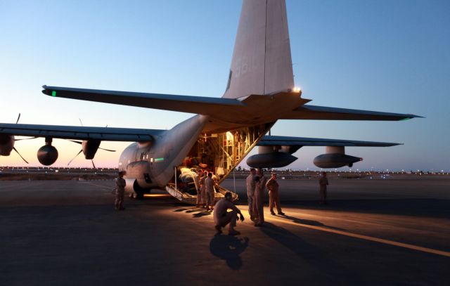 epa02617163 US Marines wait outside their Marine C-130 transport plane on the runway in Djerba Airport in Tunisia, on 05 March 2011, as it is loaded with luggage of Egyptian nationals who fled Libya and are being repatriated to Cairo. The US Marines flew at least two C-130 planes filled with Egyptians back to Cairo on 05 March night as they assist in the repatriation effort for the thousands who fled Libya. The planes are part of the 26th MEU (Marine Expedition Force), and come from a US base in Sigonella, Sicily, Italy. EPA/JIM HOLANDER