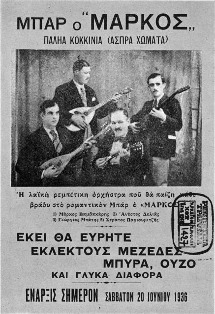 Το 1934 φτιάχνεται ο Μάρκος Βαμβακάρης και ο Γιώργος Μπάτης –μεγάλος της παρέας –με τους Ανέστη Δελιά και τον Στράτο Παγιουμτζή –έλεγαν ότι στον λαιμό του «είχε φωλιές με αηδόνια» –σχηματίζουν την πρώτη ρεμπέτικη κομπανία. Ιδρυτής ο Μάρκος, νονός ο Μπάτης, με το αλανιάρικο-καθαρευουσιάνικο «Τετράς η ξακουστή του Πειραιώς». Πρόκειται για τη ληξιαρχική πράξη γέννησης του πειραιώτικου ρεμπέτικου.