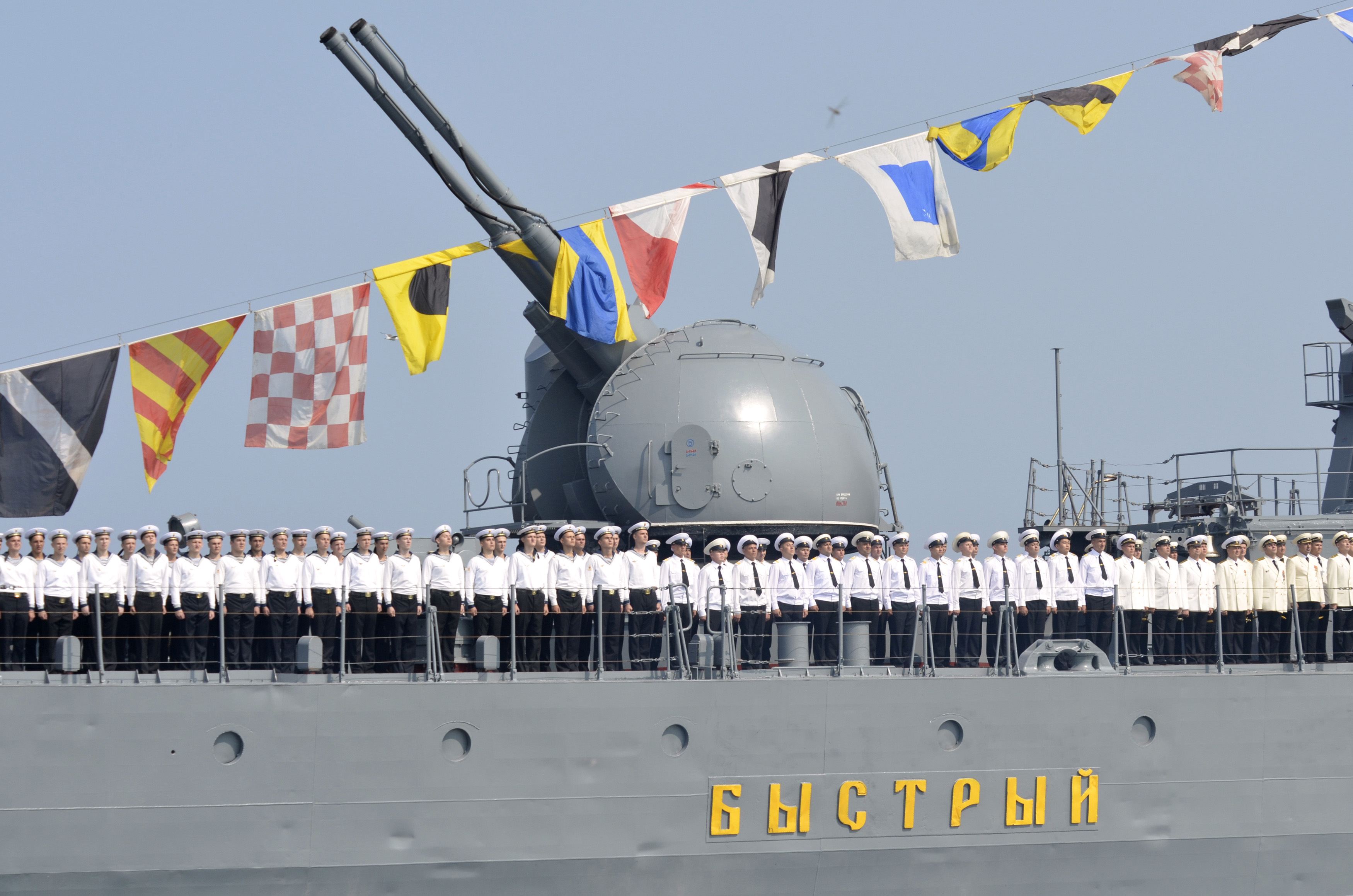 Πολεμικά πλοία ρίχνουν κανονιοβολισμούς, στρατιώτες του Στόλου της Μαύρης Θάλασσας παρελαύνουν και θεατές κυματίζουν σημαίες στο λιμάνι της χερσονήσου της Κριμαίας που προσαρτήθηκε το Μάρτιο από τη Ρωσική Ομοσπονδία.
