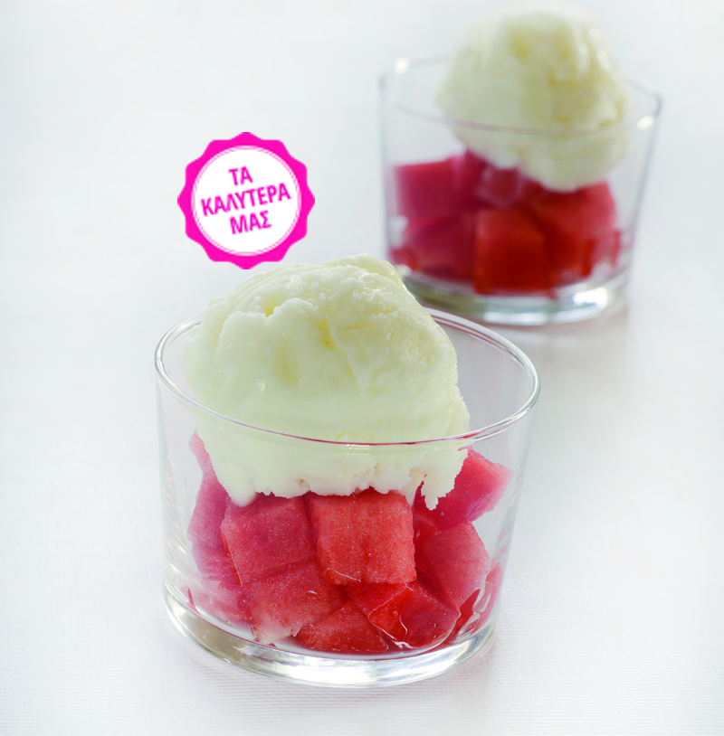 Καθαρίζουµε το καρπούζι και το κόβουµε σε κύβους. Τους βάζουµε σε µπολάκια. Με το ειδικό εργαλείο (scoop) παίρνουµε µπάλες από τη γρανίτα και τις προσθέτουµε από πάνω. {{{ moto }}}