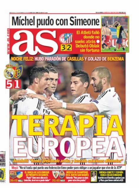 Μπορεί βασικό θέμα σε όλες τις ισπανικές εφημερίδες να ήταν το 5-1 της Ρεάλ επί της Βασιλείας, ωστόσο μεγάλης έκτασης ήταν και η αναφορά της ήττας της Ατλέτικο Μαδρίτης από τον Ολυμπιακό με 3-2 στην πρεμιέρα των ομίλων του Champions League.