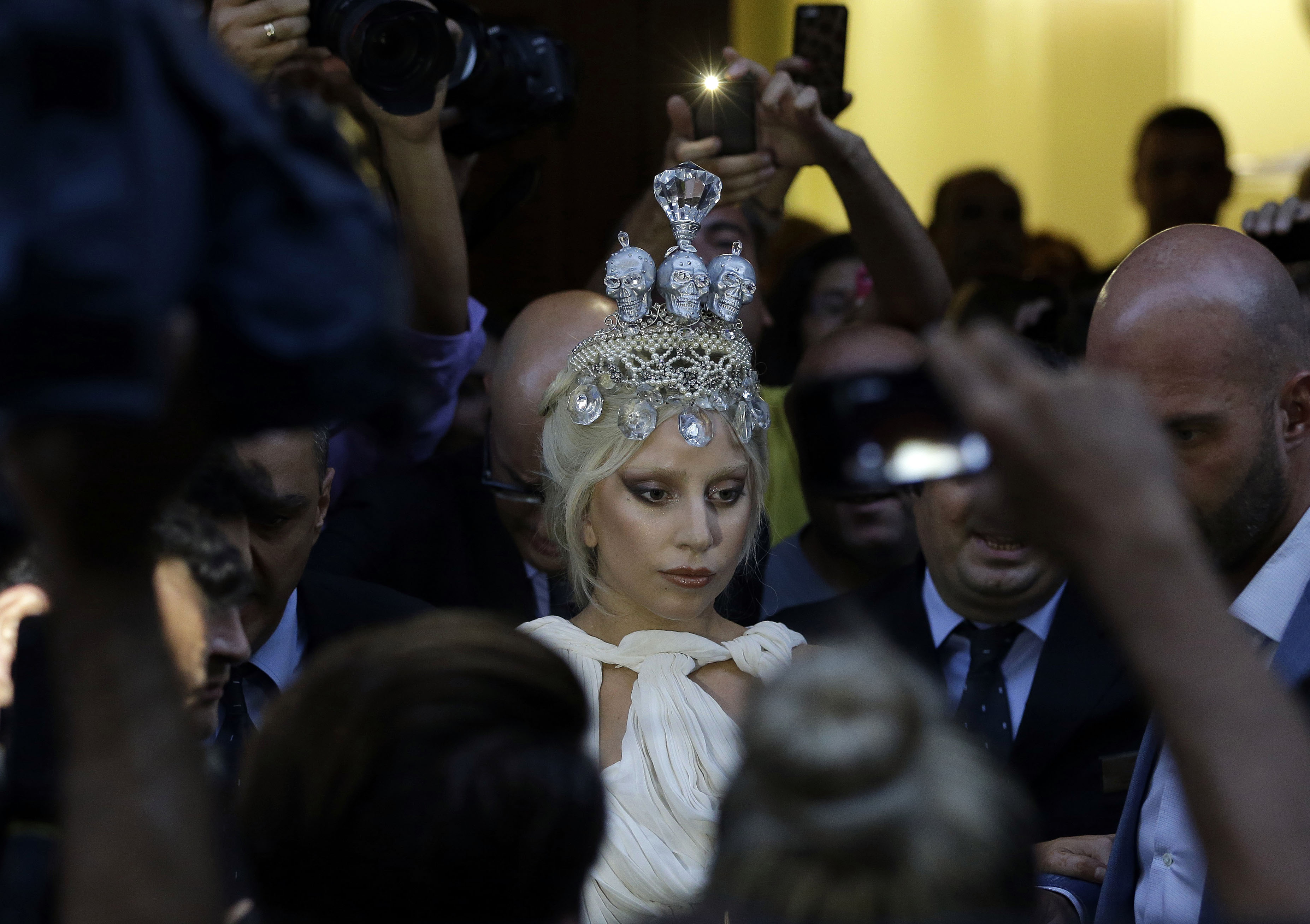 Η Lady Gaga αναχώρησε από το ξενοδοχείο για τη συναυλία με μια εμφάνιση που θύμιζε ελαφρώς αρχαία θεά: φορούσε μια περίεργη τιάρα στο κεφάλι της, ένα λευκό φόρεμα.
