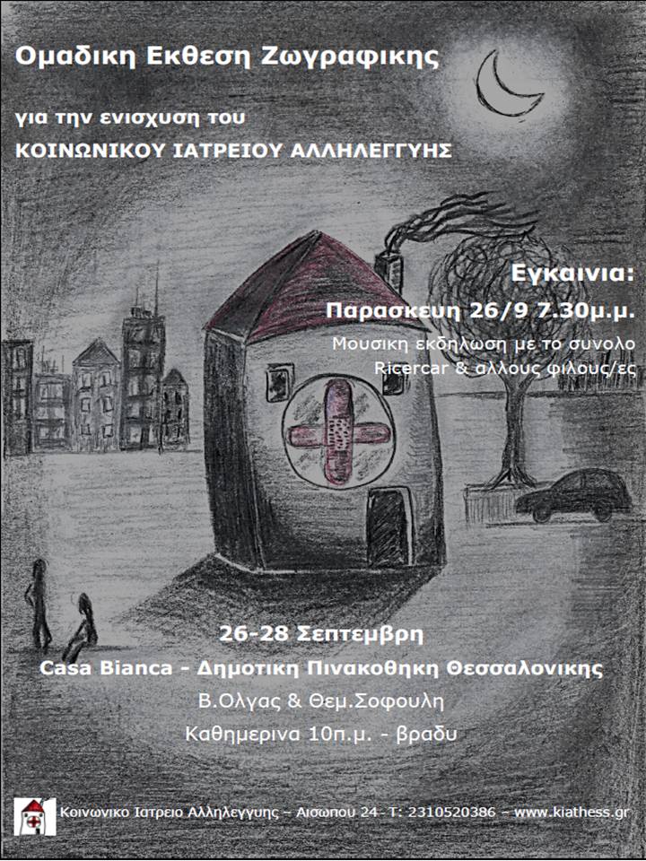 Ομαδική έκθεση ζωγραφικής με σκοπό την ενίσχυση του Κοινωνικού Ιατρείου Αλληλεγγύης Θεσσαλονίκης θα φιλοξενηθεί από την Παρασκευή 26 έως την Κυριακή 28 Σεπτεμβρίου 2014, στη Δημοτική Πινακοθήκη «Casa Bianca». Ζωγράφοι της Θεσσαλονίκης θα διαθέσουν τα έργα τους σε προσιτές τιμές, προσαρμοσμένες στις συνθήκες της εποχής.
