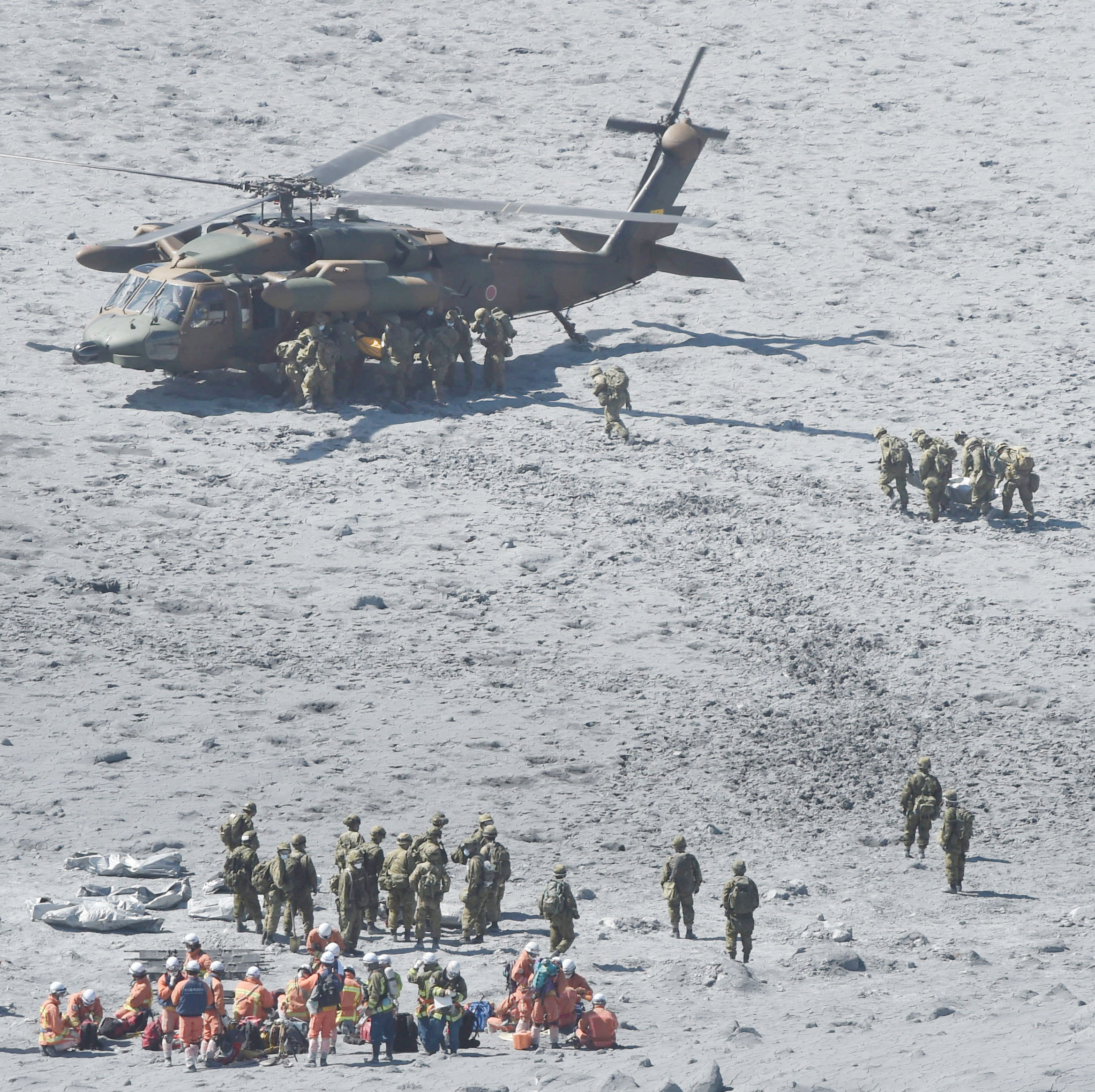 Νωρίς το πρωί, οι ιαπωνικές δυνάμεις αυτοάμυνας προσγείωσαν δύο ελικόπτερά τους στο βουνό, η επιφάνεια του οποίου καλύπτεται από παχύ στρώμα γκρίζας στάχτης που θυμίζουν σεληνιακό τοπίο. Δύναμη 1.000 εθελοντών μετέχει στις επιχειρήσεις.