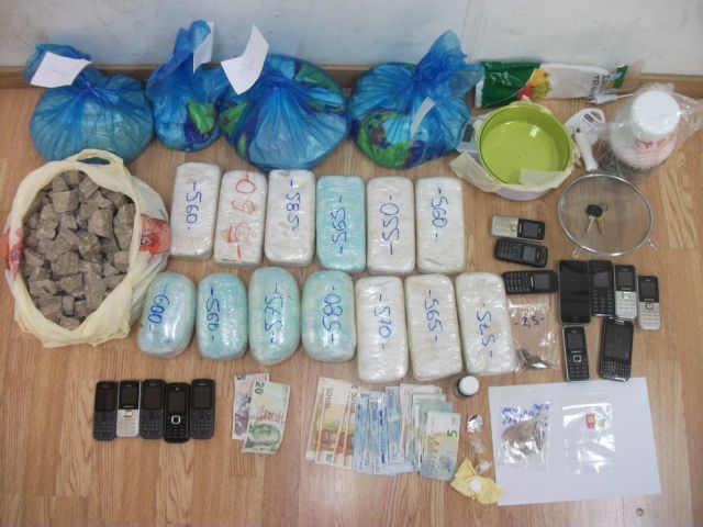 ποσότητα σκόνης άγνωστης χημικής συστάσεως βάρους 5 κιλών και 620 γραμμαρίων, 2,5 γραμμάρια κάνναβης, πέντε ναρκωτικά δισκία, 39,4 γραμμάρια μεθαδόνης σε υγρή μορφή, ένα ΙΧ αυτοκίνητο, μια μοτοσικλέτα, 1.000 ευρώ, 25 λίρες Τουρκίας και 14 κινητά τηλέφωνα.
