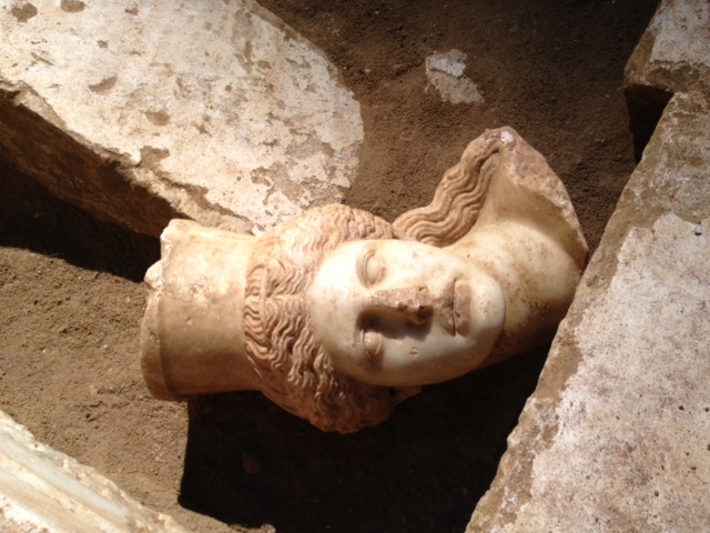 Σε βάθος 0,15μ. από την επιφάνεια του κατωφλίου εντοπίστηκε και αποκαλύφθηκε το μαρμάρινο κεφάλι Σφίγγας. (φωτο 5,6,7,8) Είναι ακέραιο με ελάχιστη θραύση στη μύτη. Έχει ύψος 0,60 μ. Το κεφάλι ταυτίζεται και αποδίδεται στον κορμό της ανατολικής Σφίγγας, όπου ήταν ένθετο. Στρέφεται προς την είσοδο και φέρει πόλο. Στο κάτω μέρος του λαιμού σώζεται ακέραιη η διατομή της έδρασης στο σημείο ένθεσης στον κορμό της. Έχει κυματιστούς βοστρύχους, που φέρουν ίχνη κόκκινου χρώματος, οι οποίοι πέφτουν στον αριστερό ώμο της, ενώ συγκρατούνται από λεπτή ταινία. Πρόκειται για γλυπτό εξαιρετικής τέχνης. Βρέθηκαν, επίσης, θραύσματα από τα φτερά των Σφιγγών.