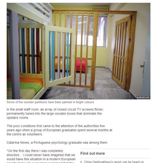 «Η εννιάχρονη Τζένη κάθεται μέσα στο ξύλινο κλουβί της και κουνιέται μπρος-πίσω χαζεύοντας τις ξύλινες μπάρες. Είναι συνηθισμένη σε αυτού του τύπου την καθημερινότητα, καθώς μένει στο ίδιο αυτό κλουβί από τα δυο της χρόνια» αναφέρει το BBC, περιγράφοντας μια κατάσταση όπου τα παιδιά περνούν μεγάλο μέρος της ημέρας σε χώρους και κρεβάτια περιοριζόμενα από ξύλινες διαχωριστικές μπάρες.