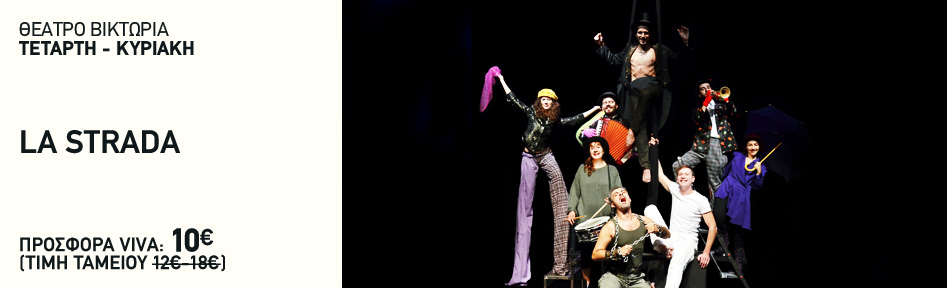Το ‘’LA STRADA’’ του Φελλίνι, θεατρική διασκευή βασισμένη στην ομώνυμη ταινία, θα παρουσιαστεί στην Κεντρική Σκηνή του THEATROVICTORIA, από τη Τετάρτη 5 Νοεμβρίου, σε σκηνοθεσία του Βασίλη Νικολαΐδη με τους Κάτια Γέρου, Θανάση Κουρλαμπά και Νίκο Νίκα στους βασικούς ρόλους. Η παράσταση θα παίζεται κάθε Τετάρτη στις 7:30, Πέμπτη έως Σάββατο στις 9:00μμ και Κυριακή στις 8:00μμ{{{ moto }}}