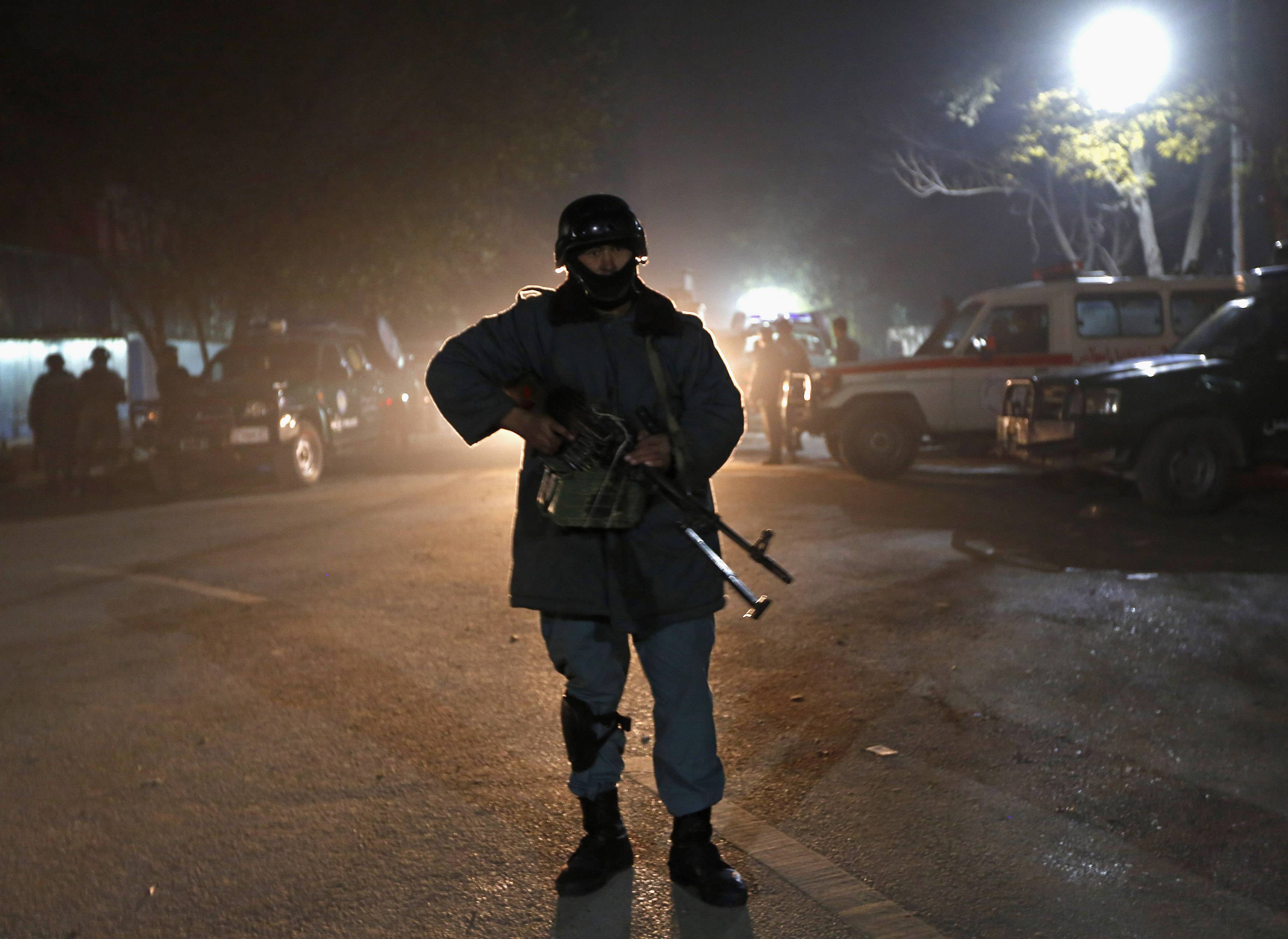 A police officer stands guard after arriving at the site of an incident in Kabul November 27, 2014. An explosion shook houses in the diplomatic quarter of the Afghan capital on Thursday evening and was followed by heavy gunfire that could still be heard an hour later, according to Reuters witnesses and security officials. REUTERS/Omar Sobhani (AFGHANISTAN - Tags: CIVIL UNREST) (File: 2014-11-27T161436Z_941692762_GM1EABS00JK01_RTRMADP_3_AFGHANISTAN-BLAST.JPG )