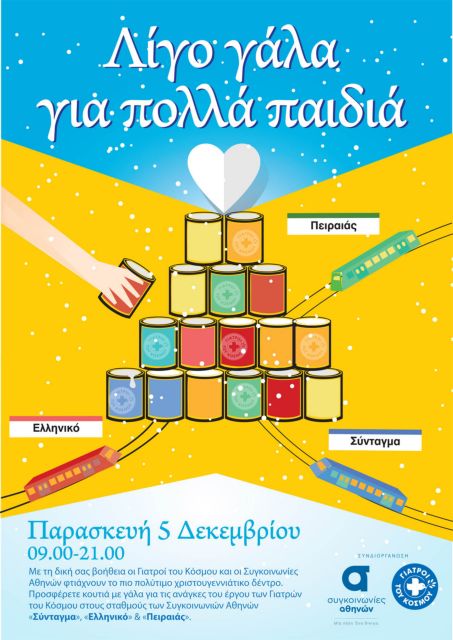 Το πιο ξεχωριστό χριστουγεννιάτικο δέντρο από γάλα στην Αθήνα θα στολίσουν και εφέτος οι Γιατροί του Κόσμου σε συνεργασία με τις συγκοινωνίες Αθηνών. «Τα φετινά Χριστούγεννα γινόμαστε ακόμη περισσότεροι και συγκεντρώνουμε πιο πολύ γάλα από ποτέ. Με τη συνδρομή των Συγκοινωνιών Αθηνών, το δέντρο από γάλα που τόσο αγαπήσαμε μετακομίζει στον χώρο πολλαπλών χρήσεων στο σταθμό του μετρό Σύνταγμα και απλώνει τα κλαδιά του στους σταθμούς Ελληνικό και Πειραιάς» αναφέρουν σε ανακοίνωση τους οι Γιατροί του Κόσμου.