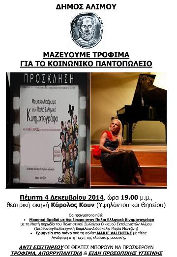 Μουσική βραδιά για το Κοινωνικό Παντοπωλείο του Δήμου Αλίμου διοργανώνεται απόψε, Πέμπτη, 4 Δεκεμβρίου 2014, στη Θεατρική Σκηνή «Κάρολος Κουν». Οι θεατές μπορούν αντί εισιτηρίου, να προσφέρουν τρόφιμα, απορρυπαντικά και είδη προσωπικής υγιεινής για τους συμπολίτες μας που έχουν ανάγκη. Η εκδήλωση θα ξεκινήσει στις 19.00.