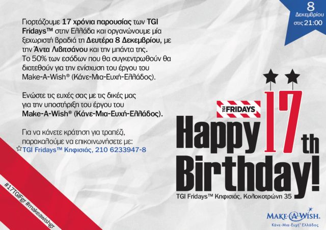 Σε μια μεγάλη γιορτή για τα 17 χρόνια παρουσίας τους στην Ελλάδα, τα TGI Fridays™ διοργανώνουν μια βραδιά αφιερωμένη στο έργο του Make-A-Wish, τη Δευτέρα 8 Δεκεμβρίου στο κατάστημα της Κηφισιάς. Το 50% των εσόδων της ξεχωριστής βραδιάς, την οποία θα ντύσει μουσικά η Άντα Λιβιτσάνου με τη μπάντα της, θα διατεθεί για το έργο του οργανισμού.
