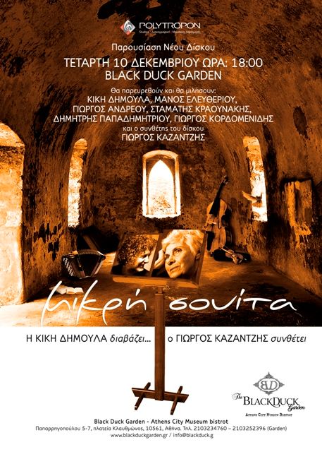 Την Τετάρτη, 10 Δεκεμβρίου 2014, θα πραγματοποιηθεί η παρουσίαση της «Μικρής Σουίτας» (Polytropon) όπου θα παρευρεθούν και θα μιλήσουν οι: Κική Δημουλά, Μάνος Ελευθερίου, Γιώργος Ανδρέου, Σταμάτης Κραουνάκης, Δημήτρης Παπαδημητρίου, Γιώργος Κορδομενίδης και ο συνθέτης του CD Γιώργος Καζαντζής. Οι ηθοποιοίΘανάσης ΠαπαγεωργίουκαιΕύα Καμινάρηθα διαβάσουν μερικά από τα ποιήματα τηςΚικής Δημουλάπου περιέχονται στο CD με τη συνοδεία του συνθέτη στο πιάνο και τουΗρακλή Βαβάτσικαστοbajan.
