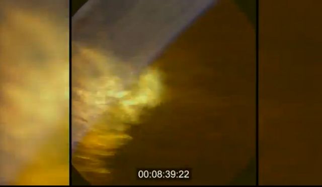 Το βίντεο ξεκινά δέκα λεπτά πριν από την προσθαλάσσωση του θαλαμίσκου στον Ειρηνικό και προέρχεται από κάμερες που βρίσκονταν στο κόκπιτ και κοιτούσαν τον ουρανό μέσα από τα παράθυρα. Το Orion εισέρχεται στην ατμόσφαιρα με ταχύτητα άνω των 32.100 χιλιομέτρων την ώρα, και σύντομα τυλίγεται σε πλάσμα.Καθώς η θερμοκρασία ανεβαίνει, το πλάσμα αλλάζει χρώμα από άσπρο σε κίτρινο σε ελαφρύ μοβ και τελικά σε ματζέντα.