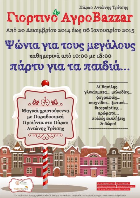 «Σας περιμένουμε όλους με χαρά στο χριστουγεννιάτικο αγροτοbazzar μας από 20/12/2014 με 6/1/2015, 10:00 με 18:00 με facepainting, tatoos, εργαστήρια χαρακτικής, κατασκευής γιορτινών καρτών- ξύλινων παιχνιδιών, γεύσεις- αρώματα- δώρα- cupcakes» αναφέρουν οι διοργανωτές σε ανακοίνωσή τους.