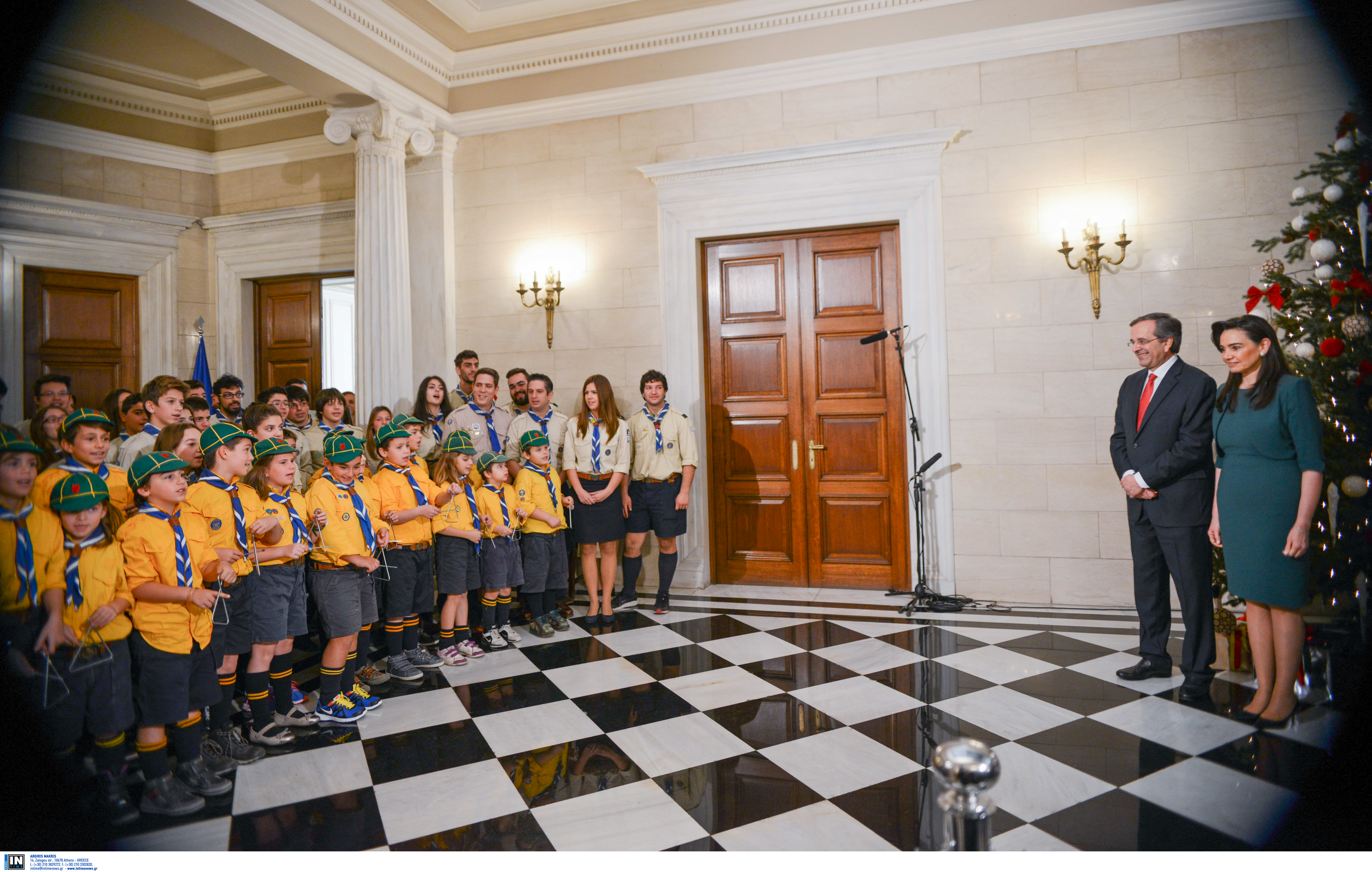 Ο σύλλογος «Νέοι Ορίζοντες» του δήμου Ευρώτα Λακωνίας, η μπάντα της Ελληνικής αστυνομίας και της Πυροσβεστικής, αλλά και πρόσκοποι από το Σώμα Ελλήνων Οδηγών επισκέφτηκαν το Μέγαρο Μαξίμου για να ψάλλουν τα χριστουγεννιάτικα κάλαντα στον πρωθυπουργό, Αντώνη Σαμαρά, και την σύζυγό του.