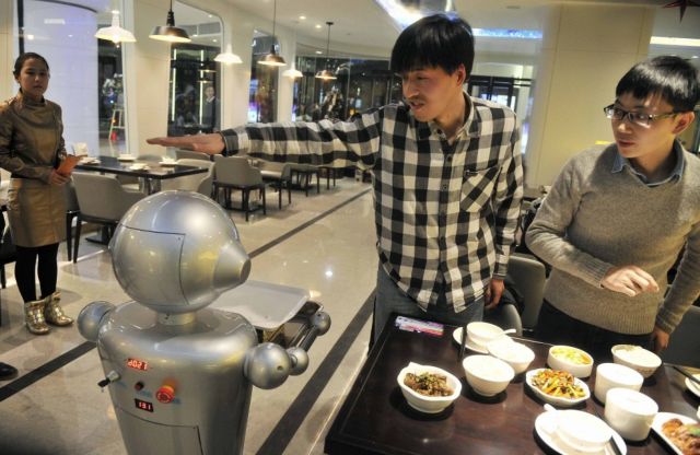 Το μηχανικό προσωπικό του εστιατορίου, ξέρει να μιλά και να χαιρετά τους πελάτες, να σερβίρει τα πιάτα και να μαγειρεύει.