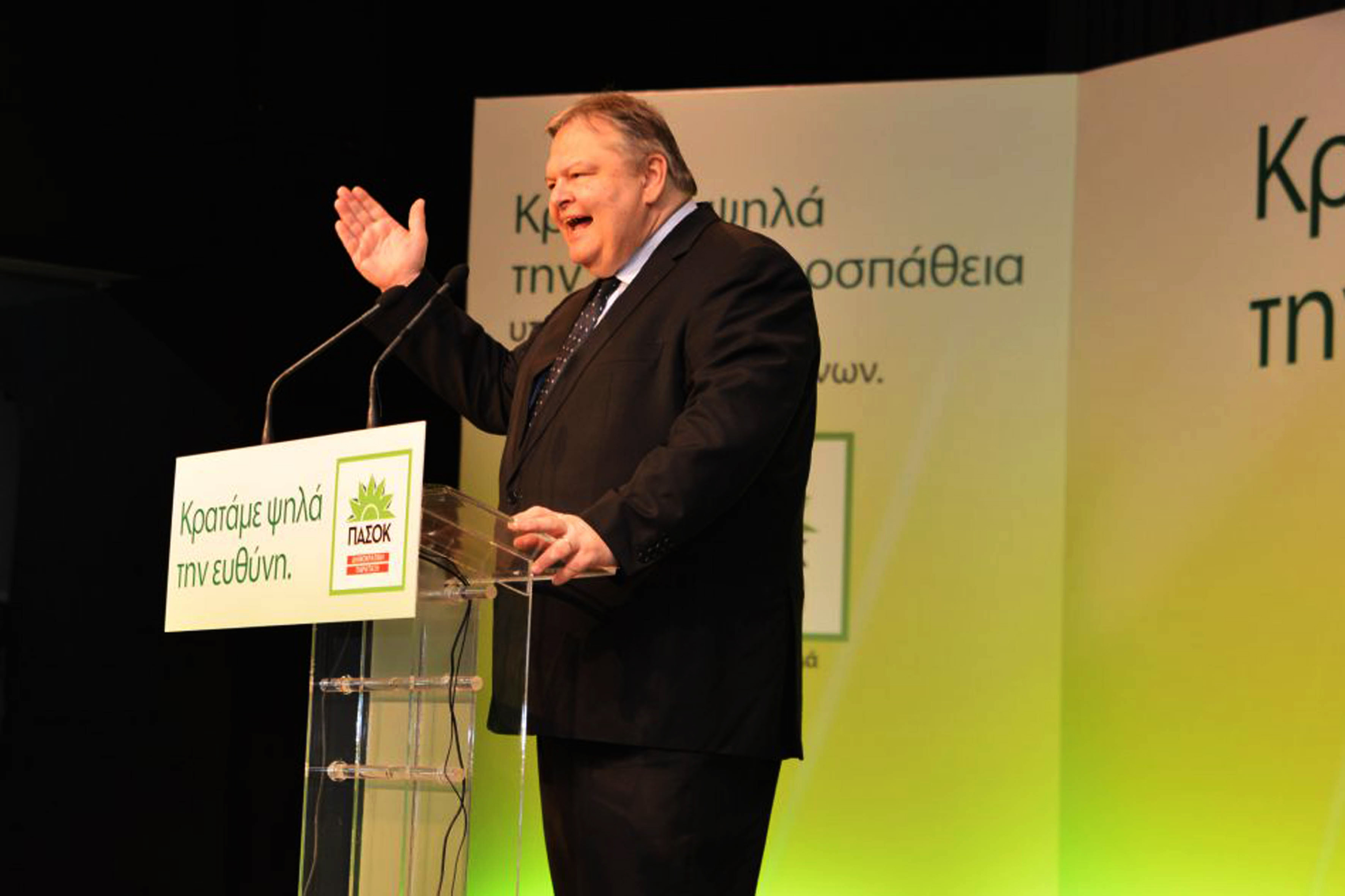 O πρόεδρος του ΠΑΣΟΚ, Αντιπρόεδρος της Κυβέρνησης και Υπουργός Εξωτερικών Ευάγγελος Βενιζέλος μιλάει στο Δημοτικό Ωδείο Λάρισας, στο πλαίσιο της προεκλογικής του περιοδείας, Πέμπτη 8 Ιανουαρίου 2015. ΑΠΕ ΜΠΕ/ΑΠΕ ΜΠΕ/ΒΑΣΙΛΙΚΗ ΠΑΣΧΑΛΗ (File: 14845896.jpg )